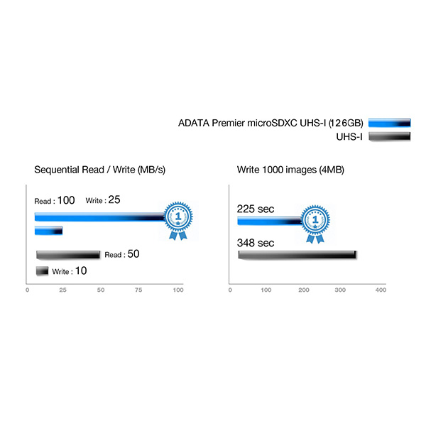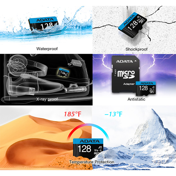 Take care of your customers' high-quality recording, data storage, and more with ADATA's 128GB Premier MicroSDHC/SDXC UHS-I Class 10 V10 A1 Memory Card with Adapter! ADATA's 128GB Premier MicroSDHC/SDXC UHS-I Class 10 V10 A1 Memory Card with Adapter provides read speeds for your customers of up to 100MB per second for rapid file transfers. Featuring a Class 10 performance rating, the 128GB Premier MicroSDHC/SDXC UHS-I Class 10 V10 A1 Memory Card enables uninterrupted, high-quality recording of Full HD video on smartphones and tablets. It also meets the A1 standard for quicker and smoother execution of APPs. Being V10 (Video Speed Class) qualified, they can record up to 10MB of video per second. Backed by solid multi-point protection, the 128GB Premier MicroSDHC/SDXC UHS-I Class 10 V10 A1 Memory Card allow your customers to easily record and store their memories! Additionally, the memory card comes with an SD adapter that allows it to be used on various devices. ADATA offers an extended lifetime warranty for the 128GB Premier MicroSDHC/SDXC UHS-I Class 10 V10 A1 Memory Card with Adapter, ensuring the best quality, performance, and customer satisfaction. Features: Stores Over 65,500 Songs, 63,000 High-Resolution Photos, Or Other Digital Data. Rapid Data Transfer Up To 100MB/s Supports Full HD Video Recording A1 Qualified Faster App Performance Multiple Device Compatibility High Durability Supports Error Correcting Code ( ECC ) Prevents Corruption & Data Loss Built-In Write-Protection Switch Lifetime Warranty