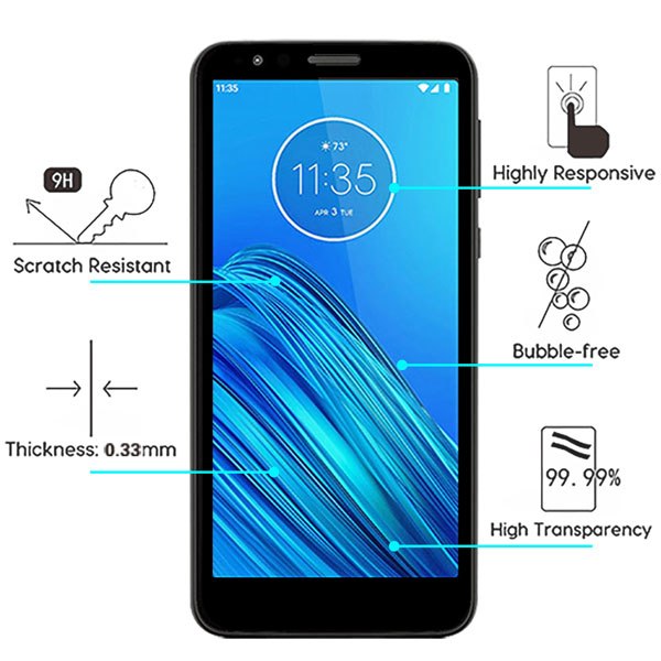 Get the ultimate double-edged protection with the high-performing MYBAT Tempered Glass Screen Protector for the curvaceous MOT-Moto E6 Micro-grid technology ensures ultimate touch screen sensitivity and easy application without forming any air bubbles or watermarks in between the screen and the tempered glass screen protector Scratch-resistant surface, with 9H hardness, provides high resistance to shock and damage from sharp objects while providing maximum image clarity Polished, rounded-edge design offers a smooth feel to the perimeter while providing optimal impact protection to the screen Shatterproof technology keeps the user and phone safe from scratches and damages if broken Oleophobic coating prevents excessive fingerprints and oil stains from contaminating the surface, making it easy to clean