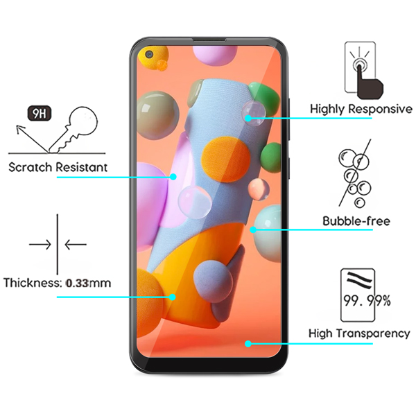 Get the ultimate double-edged protection with the high-performing MYBAT Tempered Glass Screen Protector for the curvaceous SAM-Galaxy A11 Micro-grid technology ensures ultimate touch screen sensitivity and easy application without forming any air bubbles or watermarks in between the screen and the tempered glass screen protector Scratch-resistant surface, with 9H hardness, provides high resistance to shock and damage from sharp objects while providing maximum image clarity Polished, rounded-edge design offers a smooth feel to the perimeter while providing optimal impact protection to the screen Shatterproof technology keeps the user and phone safe from scratches and damages if broken Oleophobic coating prevents excessive fingerprints and oil stains from contaminating the surface, making it easy to clean