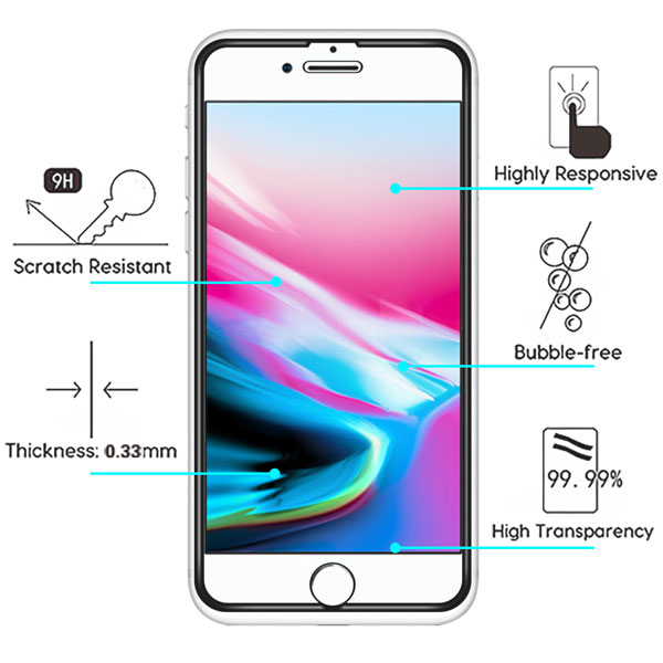 Get the ultimate double-edged protection with the high-performing MYBAT Tempered Glass Screen Protector for the curvaceous Apple iPhone 8/7/iPhone 6s/6 Micro-grid technology ensures ultimate touch screen sensitivity and easy application without forming any air bubbles or watermarks in between the screen and the tempered glass screen protector Scratch-resistant surface, with 9H hardness, provides high resistance to shock and damage from sharp objects while providing maximum image clarity Polished, rounded-edge design offers a smooth feel to the perimeter while providing optimal impact protection to the screen Shatterproof technology keeps the user and phone safe from scratches and damages if broken Oleophobic coating prevents excessive fingerprints and oil stains from contaminating the surface, making it easy to clean
