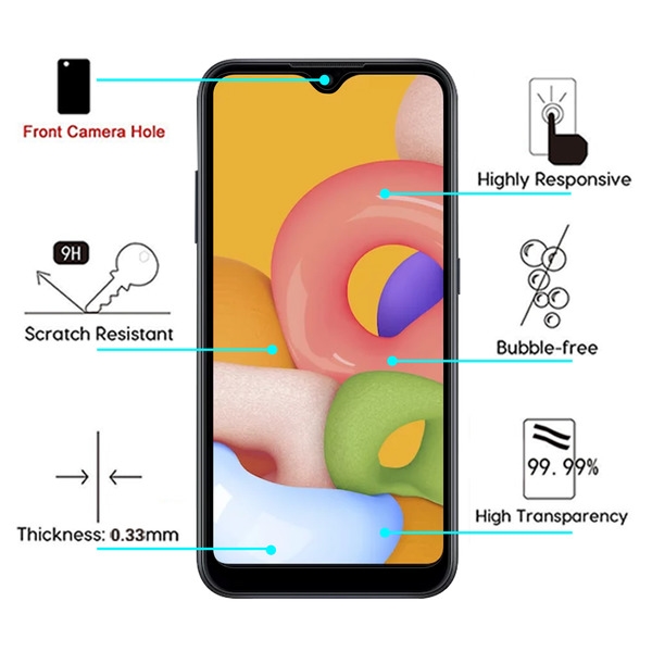Get the ultimate double-edged protection with the high-performing MYBAT Tempered Glass Screen Protector for the curvaceous SAM Galaxy A01 Micro-grid technology ensures ultimate touch screen sensitivity and easy application without forming any air bubbles or watermarks in between the screen and the tempered glass screen protector Scratch-resistant surface, with 9H hardness, provides high resistance to shock and damage from sharp objects while providing maximum image clarity Polished, rounded-edge design offers a smooth feel to the perimeter while providing optimal impact protection to the screen Shatterproof technology keeps the user and phone safe from scratches and damages if broken Oleophobic coating prevents excessive fingerprints and oil stains from contaminating the surface, making it easy to clean