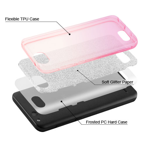 Sophisticated gradient glitter design for a radiant shine Hybrid material combining lightweight TPU soft case with frosted PC hard case Flexible wrap-around TPU soft case offers comfortable grip and easy installation Slim and compact design provides a snug fit to your device Built-in power and volume button for extra protection