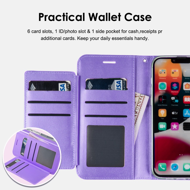 (Precise Cut-Out): Precise cutouts for speaker, camera, flash and other functional ports, allow access to all ports and functions easily, without removing the case. (High-Quality PU Leather): Soft inner layer TPU silicone + Tough outer layer High-Quality PU Leather,features dual layer protection. (Phone function): wallet cases include 6 card slots, 1 money pocket, 1 with view window can place your favorite photo,full cable/button/speaker access, a magnetic closure and a landscape kickstand.