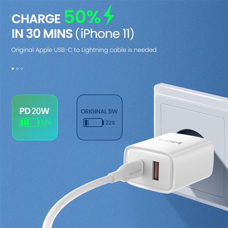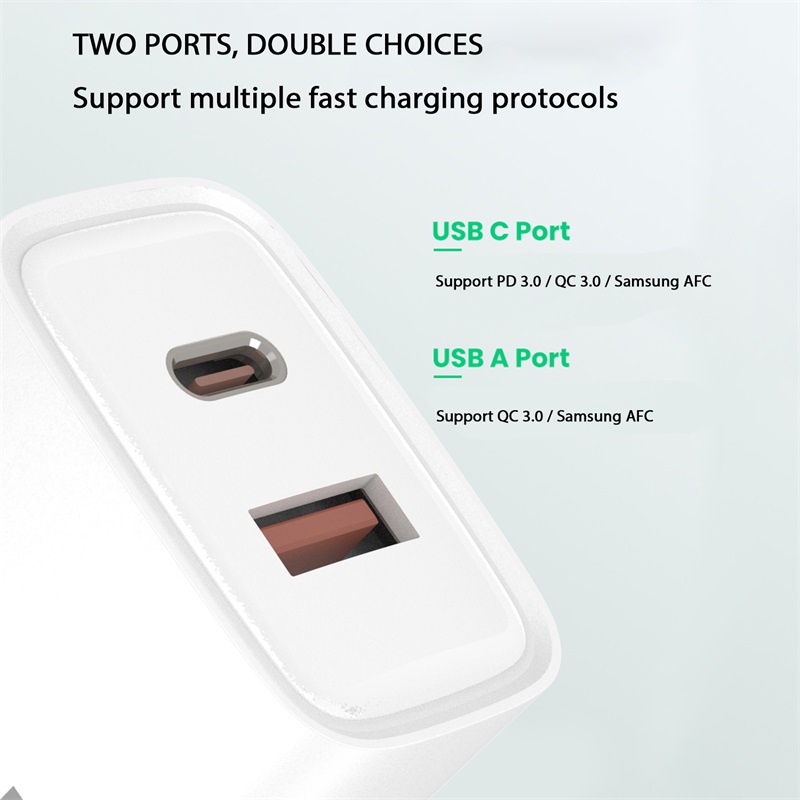 Features: Equipped with a USB-C Power Delivery port, and loaded with 20W of output power to give the latest iPhones a full-speed charge. Works flawlessly with virtually all mobile USB-C devices, as well as Apple devices using a USB-C to Lightning cable. With the intelligent chip inside, USB C wall charger matches the current as your device's need automatically. Compact Size, the power delivery charger ensures you maximum portability wherever you go. 20W Power Delivery Charger can charge your device up to 70% fasterthan standard 5W charging. Specifications Input: AC 100-240V 50-60Hz 0.5A Output: USB-A 5V/3A 9V/2A 12V/1,5A USB-C 5V/3A 9V/2.22A 12V/1,67A USB-A + USB-C 5V/3A Max Power: 20W
