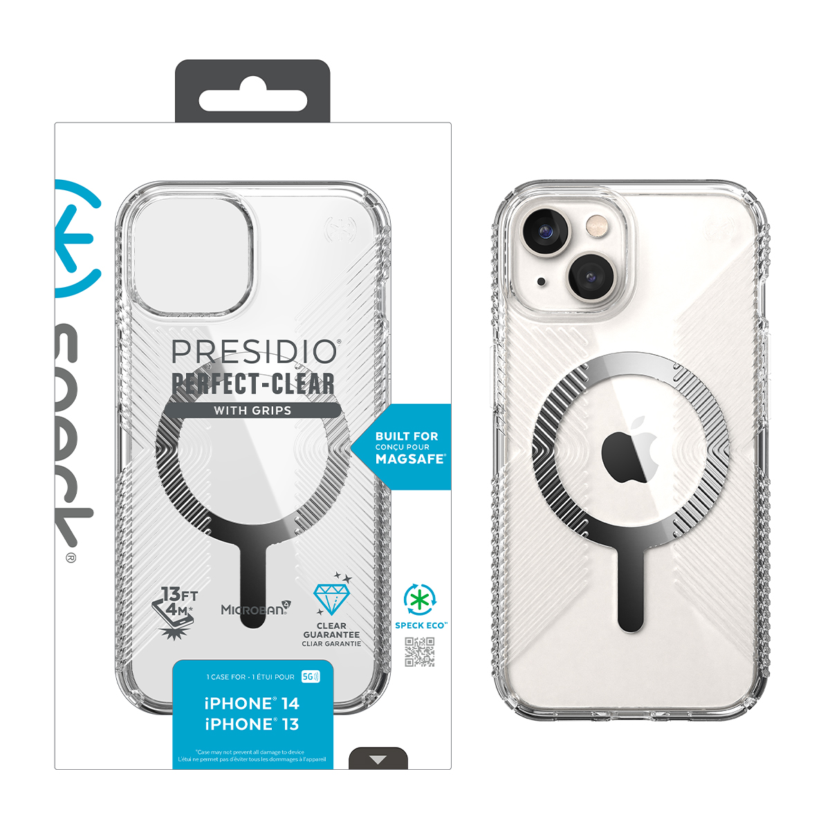 This case features innovative new materials that help it stay clear longer and provide more protection and durability. Features Speck's newly innovative no-slip inverted grips, offering great longevity, durability, and a strong grip, providing more confidence when texting, talking, or taking photos. Highly protective, yet slim, this durable case is designed with precise magnets that reliably work with all Apple MagSafe® accessories.
