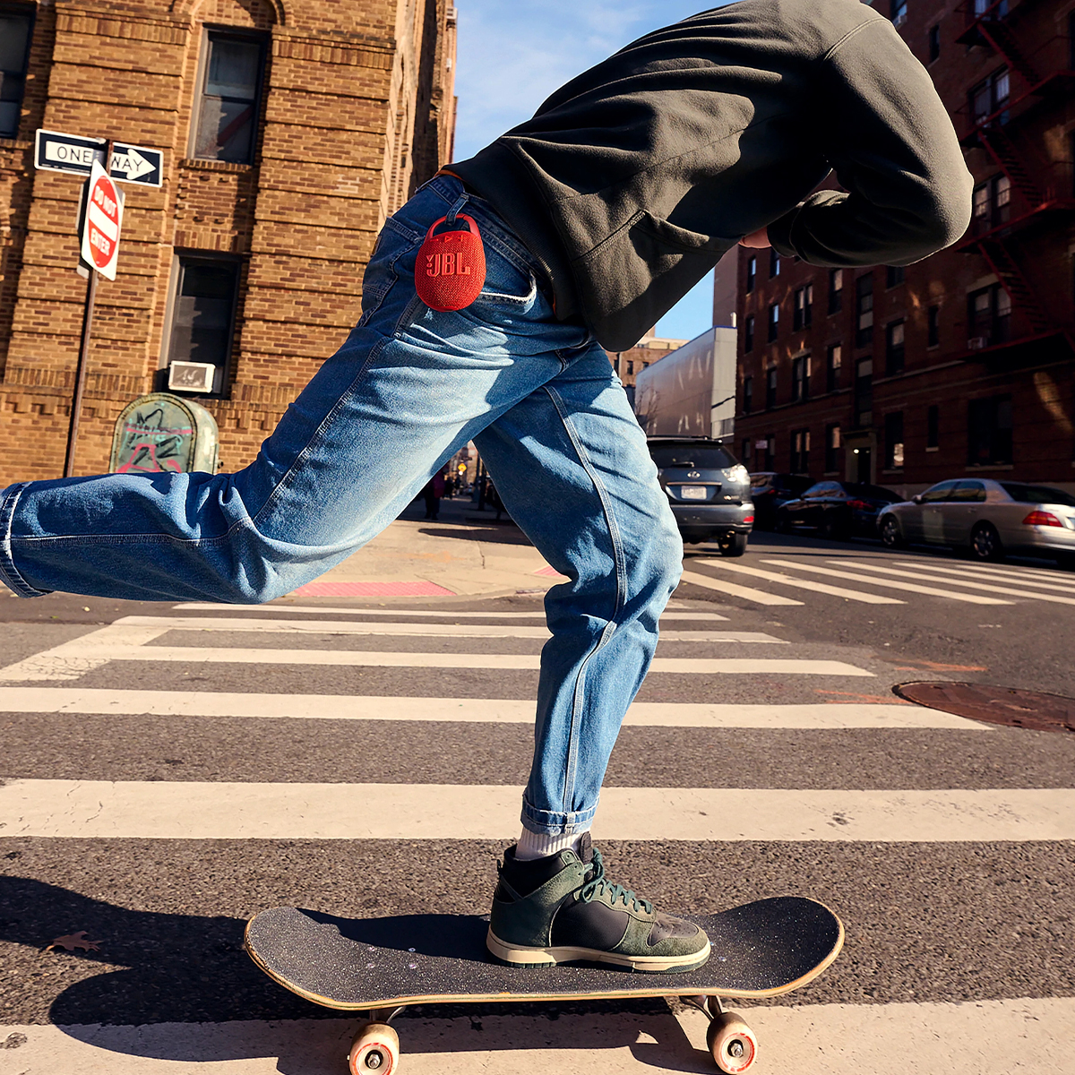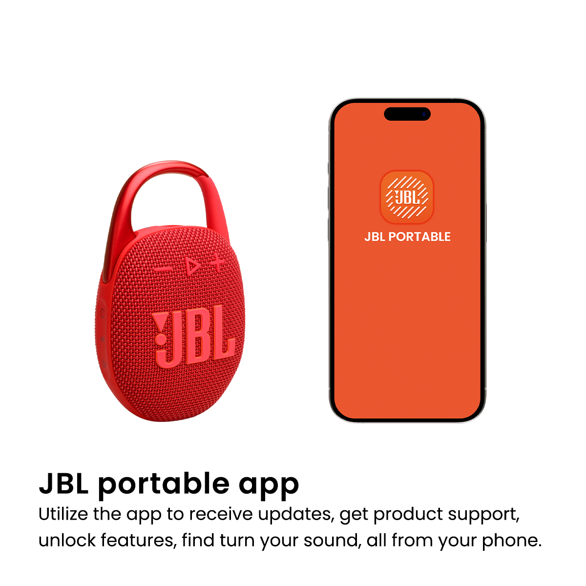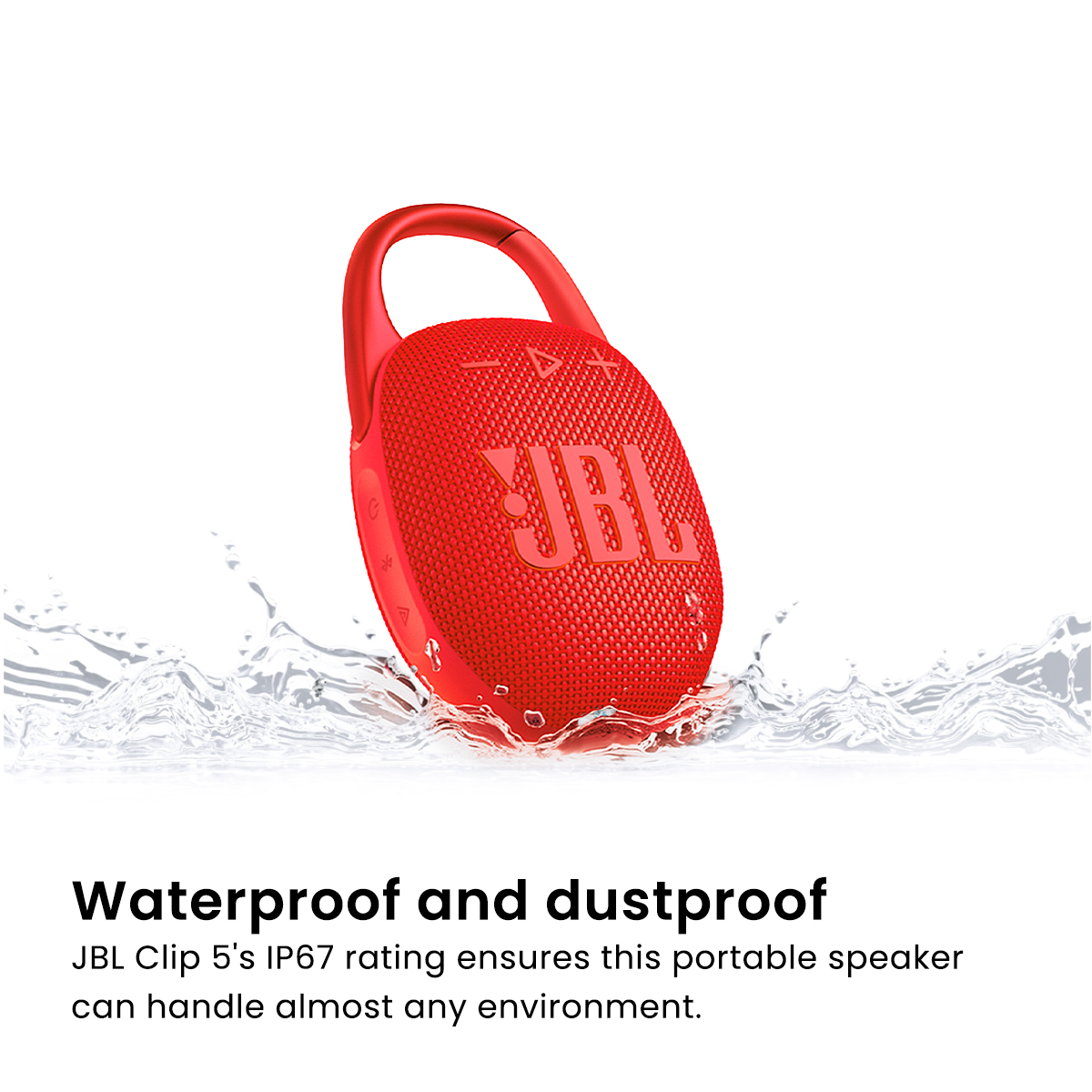Clip and Play. This ultra-portable Bluetooth speaker is small enough to hold in one hand, but don’t let the size fool you—it’s big where it counts. With a fully integrated carabiner, JBL Pro Sound, and its waterproof and dustproof rating, it’s perfect to take on a hike or camping trip. Every day is an adventure with the JBL Clip 5.