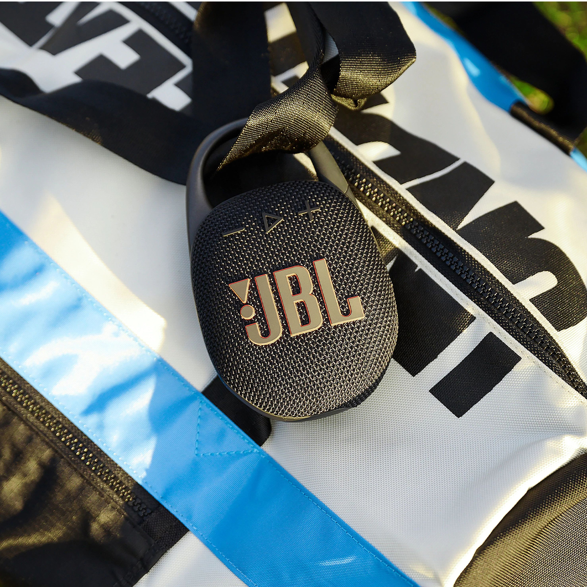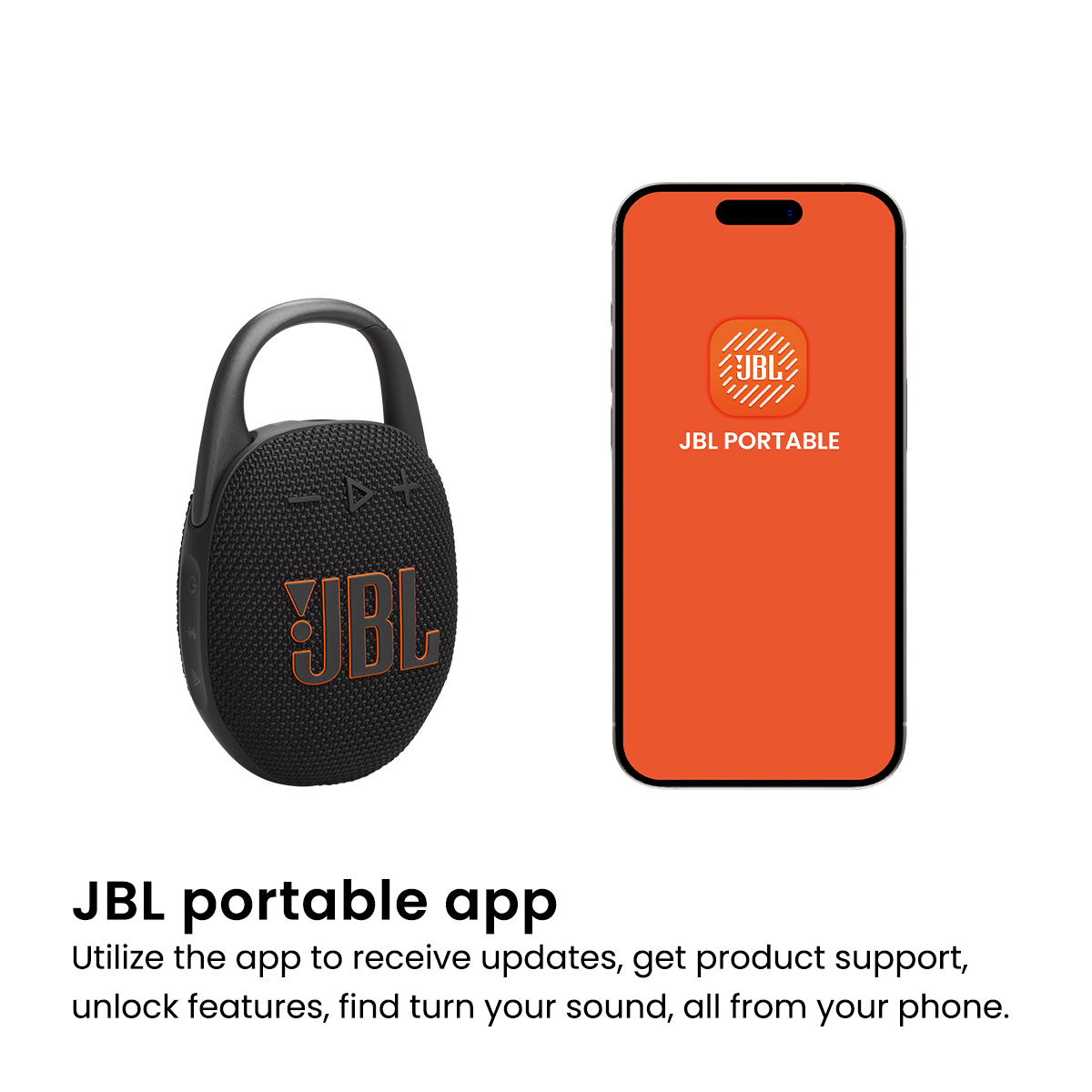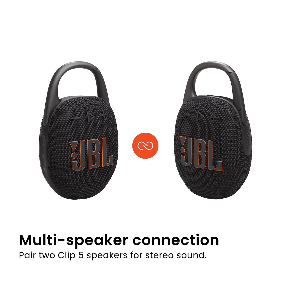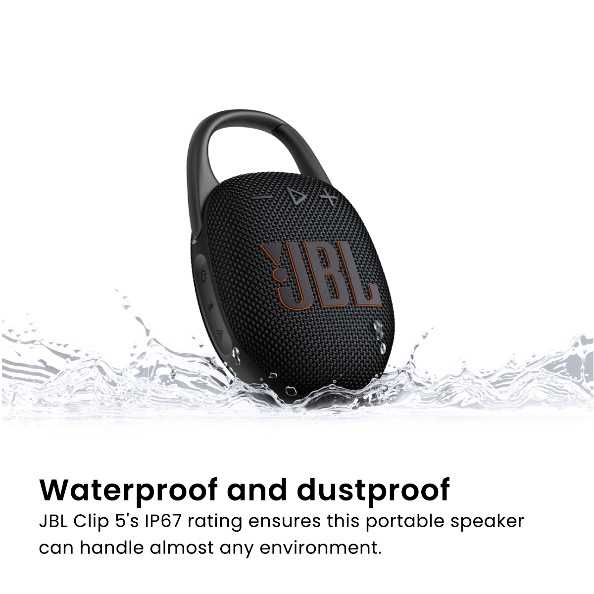 Clip and Play. This ultra-portable Bluetooth speaker is small enough to hold in one hand, but don’t let the size fool you—it’s big where it counts. With a fully integrated carabiner, JBL Pro Sound, and its waterproof and dustproof rating, it’s perfect to take on a hike or camping trip. Every day is an adventure with the JBL Clip 5.
