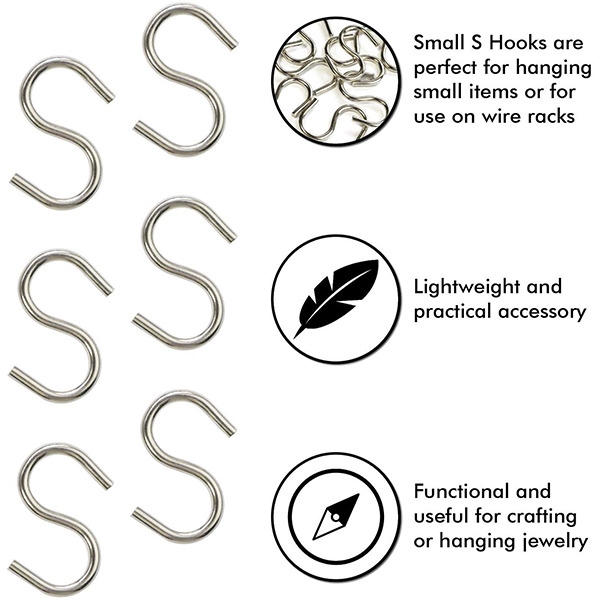 Use the 1” S-Hook from MyBat to hang display strips, signs, or merchandise from shelving or wire fixtures! It also is ideal for using with various ceiling connectors and linking signs together. This set of 100 hooks fits a 0.8” diameter wire. Each hook features rounded ends and curved tips to prevent items from sliding off. Features: Stainless Steel Fits 0.8” Diameter Wire Includes 100 Pieces