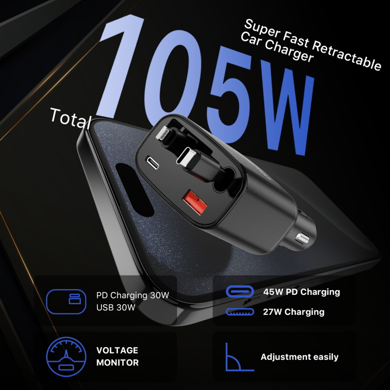 105W Max Output 80cm Retractable Cable Automatically Retract Function Charging 3 Devices Simultaneously Digital Display Aluminium Alloy Design Input: DC12-24V Output: USB-C: 5V/3A, 9V/3A, 12V/2.5A USB-A: 5V/3A, 9V/3A, 12V/2.5A Built-in cable USB-C: 5V/3A, 9V/3A, 12V/3A, 15V/3A, 20V/2.25A Total Output: 105W Max.