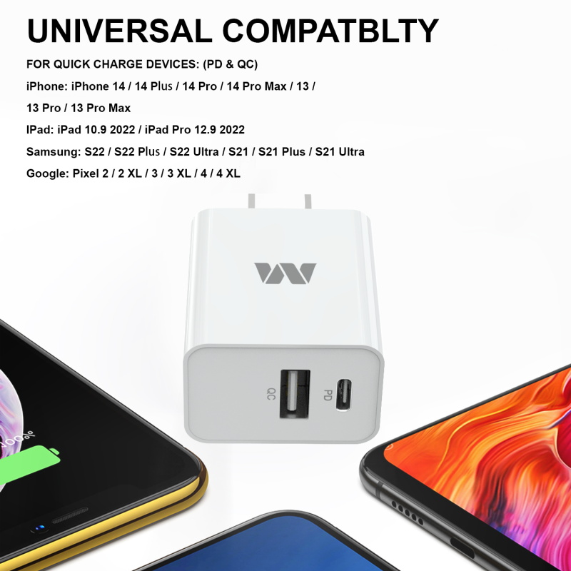 Features: Equipped with a USB-C Power Delivery port, and loaded with 22W of output power to give the latest iPhones a full-speed charge. Works flawlessly with virtually all mobile USB-C devices, as well as Apple devices using a USB-C to Lightning cable. With the intelligent chip inside, USB C wall charger matches the current as your device's need automatically. Compact Size, the power delivery charger ensures you maximum portability wherever you go. 22W Power Delivery Charger can charge your device up to 70% fasterthan standard 5 W charging. Specifications Input: AC 100-240V 50-60Hz 0.5A Output: USB-A 5V/3A 9V/2A 12V/1,5A USB-C 5V/3A 9V/2.22A 12V/1,67A PPS: 3.3-5.9V/3A, 3.3-11V/2A Max Power: 22W