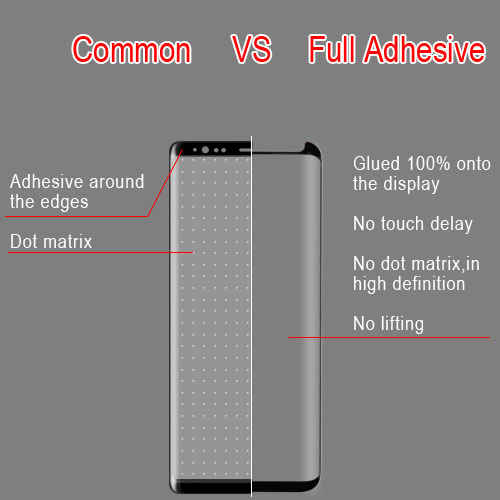 How to install Clean the screen with alcohol swab, microfiber cleaning cloth and dust removal sticker. Align the installation tray with the phone. Make sure the phone is enclosed by the installation tray. Peel off tab 1 and align the tempered glass screen protector with installation tray. Slowly lay the tempered glass screen protector down. Take off the installation tray. Remove the air bubbles trapped under the middle of glass protector by using included squeegee card up and down. Remove the air bubbles trapped under both sides of glass protector by using included squeegee card up and down. Click to watch video Features: The 3D curved tempered glass screen protector is full screen adhesive rather than just adhesive around the edges so that it ensures a complete and seamless integration with your phone. The film attaches firmly and maintains high touch sensitivity for your phone. Attentions: Installation tray plays a role of fixing the tempered glass screen protector to your phone well. The phone screen must be cleaned with cleaning set. It is advised that first remove the massive air bubbles on an up and down, middle-out way. For the remaining, up the tempered glass screen protector edge via your nail to the tiny air bubble position (No need to peel off the whole one), and then expel the remaining outward. Without uncovering the edge, while only repeatedly squeeze the tiny air bubble spot, it will destroy the adhesive layer of the glass protector. It is advised that view the instruction video online before installation. It is difficult for a beginner to install the tempered glass screen protector well. If the screen protector is slightly misplaced over the screen, it will not fit. So it is recommended that ask an experienced person to do the work. Full Adhesive Premium Tempered Glass Screen Protector approximate thickness: 0.33mm glass+0.45mm AB glue. Notes: The 3D curved tempered glass screen protector is scaled down and case-friendly to avoid the case lifting the glass protector. Black borders on both sides of the glass protector will slightly cover the phone screen edges and there is a slight leakage of light seen from the sides. But it will not affect the normal use.