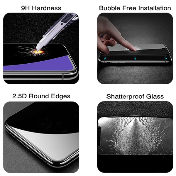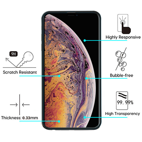 Get the ultimate double-edged protection with the high-performing MYBAT Tempered Glass Screen Protector for the curvaceous iPhone XS Max Micro-grid technology ensures ultimate touch screen sensitivity and easy application without forming any air bubbles or watermarks in between the screen and the tempered glass screen protector Scratch-resistant surface, with 9H hardness, provides high resistance to shock and damage from sharp objects while providing maximum image clarity Polished, rounded-edge design offers a smooth feel to the perimeter while providing optimal impact protection to the screen Shatterproof technology keeps the user and phone safe from scratches and damages if broken Oleophobic coating prevents excessive fingerprints and oil stains from contaminating the surface, making it easy to clean