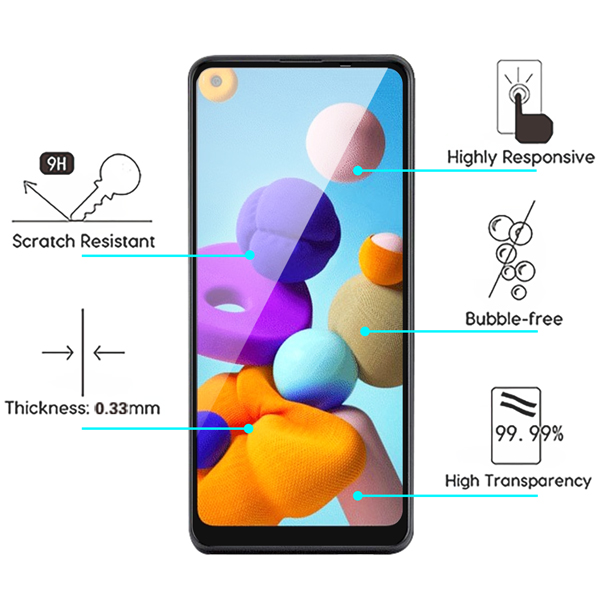 Get the ultimate double-edged protection with the high-performing MYBAT Tempered Glass Screen Protector for the curvaceous SAM-Galaxy A21 Micro-grid technology ensures ultimate touch screen sensitivity and easy application without forming any air bubbles or watermarks in between the screen and the tempered glass screen protector Scratch-resistant surface, with 9H hardness, provides high resistance to shock and damage from sharp objects while providing maximum image clarity Polished, rounded-edge design offers a smooth feel to the perimeter while providing optimal impact protection to the screen Shatterproof technology keeps the user and phone safe from scratches and damages if broken Oleophobic coating prevents excessive fingerprints and oil stains from contaminating the surface, making it easy to clean