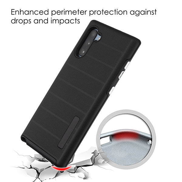 Rugged double-layered design with rubberized TPU interior and tough PC exterior Anti-slip textured backside improves grip and prevents phone from slipping out of your hand Raised front bezel and camera opening prevent scratches to the screen and camera lens Built-in button design offers perfect responsiveness Enlarged cutout openings is suitable for most cables
