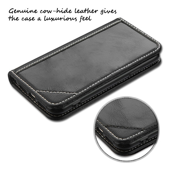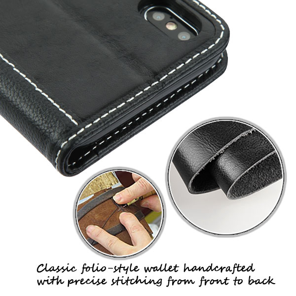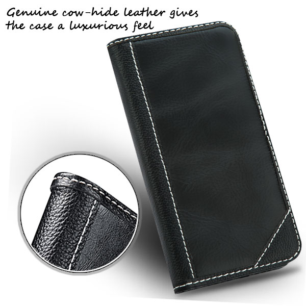 Genuine cow-hide leather gives the case a luxurious feel Classic folio-style wallet handcrafted with precise stitching from front to back Multiple slots are available for ID, credit cards and cash storage Built-in premium quality snap-on case gives your phone an all-around protection Transform the wallet into a media stand by flipping back the front cover to prop up the phone and read hands free TPU cover with precise openings to hold your phone firmly