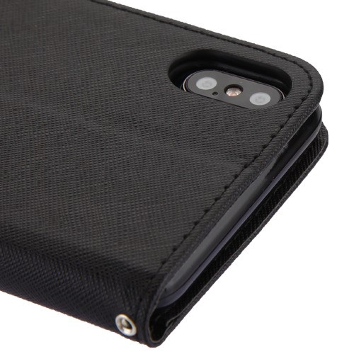 Folio-style wallet case with cross-grain PU leather design Magnetic flap secures your phone and other contents Built-in TPU case protects the phone from impacts and falls Multiple slots are available for ID, credit cards and cash storage Top cover transforms into a kickstand when folded back Carry your phone with detachable wrist strap