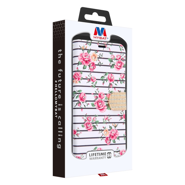 Folio-style wallet case with beautiful diamond-encrusted design Magnetic buckle closure secures your phone and other contents Multiple slots are available for ID, credit cards and cash storage