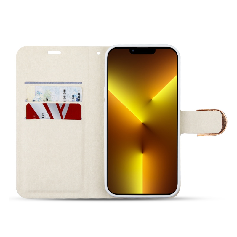 Folio-style wallet case with beautiful diamond-encrusted design Magnetic buckle closure secures your phone and other contents Multiple slots are available for ID, credit cards and cash storage