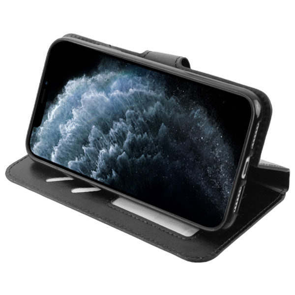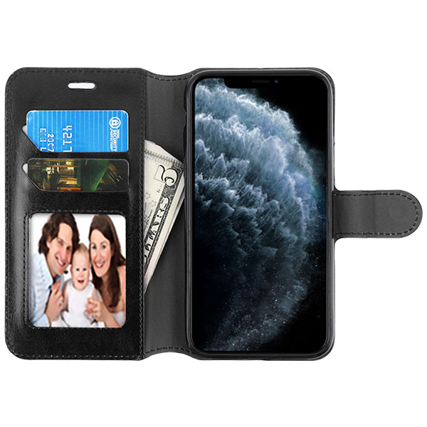 Book-style case with built-in TPU protector cover Smooth leatherette finish that is professional and sleek Includes multiple card slots and convenient money pocket Top cover transforms into a kickstand when folded back Precise cutouts for camera, buttons and speakers