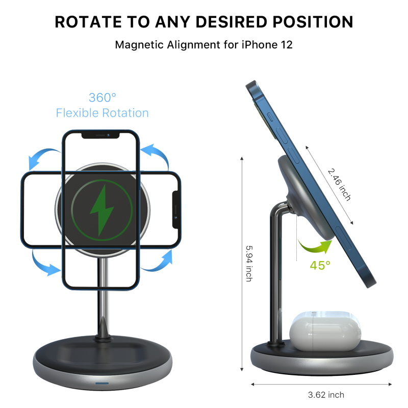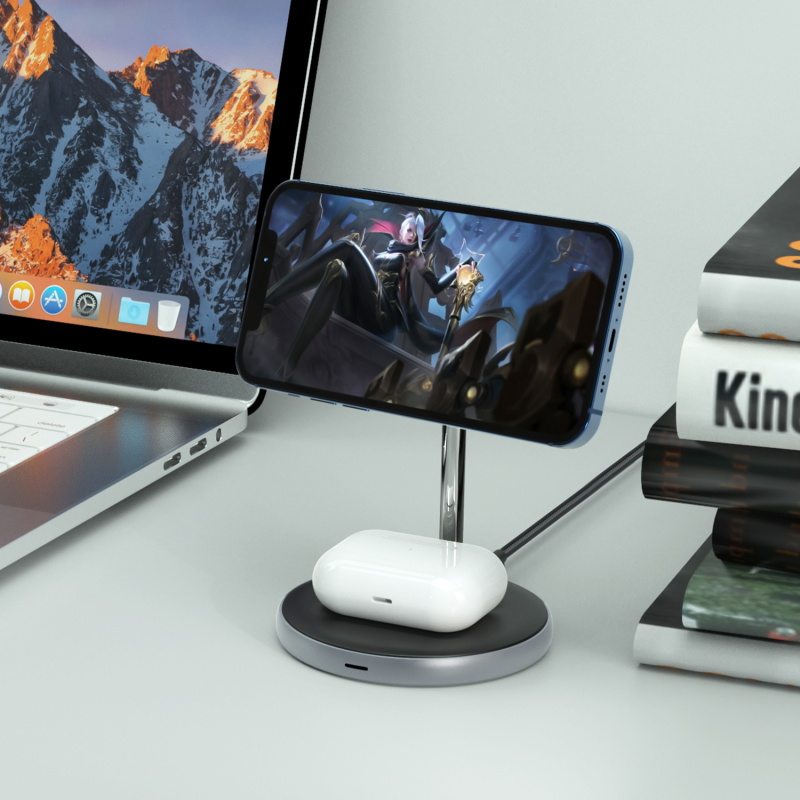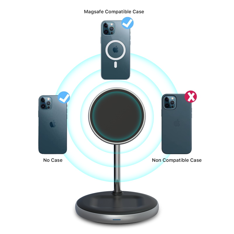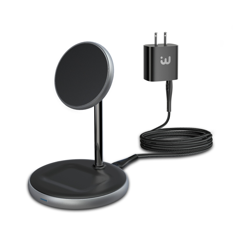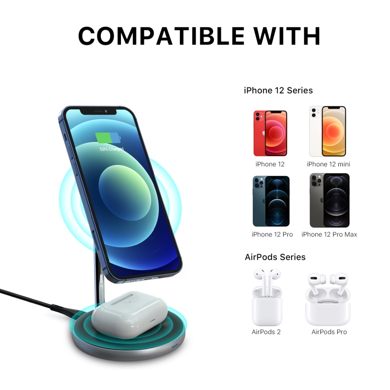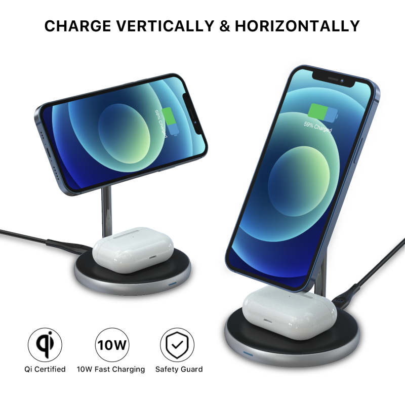 Offer your customers the 2-in-1 Wireless Charging Stand from MyBat Pro to reduce their dependency on cluttering cables and take advantage of their iPhone 12 or 13’s MagSafe functionality. Stylish packaging not only makes this wireless charging solution attractive on the shelves but also showcases the product beautifully, making it a great addition to your inventory that's sure to sell well. Your customers will be able to set their iPhone 12 or 13 and wireless earbuds on the 2-in-1 MagSafe Wireless Charging Station and get up to 10W of immediate fast charging. That's 2X more power than the standard wired charger! Instead of plugging and unplugging cables, your customers will enjoy the strong magnetic hold provided by the MagSafe compatible fast-charging 7.5W phone stand and a 2.5W charging pad for AirPods and other wireless earbuds. With an adjustable viewing angle of up to 50°, customers can quickly find the perfect positioning to watch shows or videos and quickly catch up on notifications while charging in either portrait or landscape. The trendy and multi-functional design, crafted from premium metallic alloy, keeps the charging stable sturdy, so they don’t have to worry about accidental falls. A 20W power adapter and a USB-C to USB-C cable are included to provide maximum charging versatility to your customers. MyBat Pro offers a lifetime warranty for the 2-in-1 Wireless Charging Stand, ensuring the best quality, performance, and customer satisfaction. Features: Charge 2 Devices Simultaneously Made for Qi-compatible Devices MagSafe Compatible: iPhones & Cases Powerful Magnetic Alignment 2 Wireless Charging Surfaces 7.5W iPhone & Android Wireless Fast Charge 2.5W Wireless Earbud Charging Pad Adjustable Viewing Angles Charge/View in Portrait & Landscape LED Charging Indicator Premium Metallic Alloy Construction Incredible Safety Features Includes 20W PD Power Adapter & USB-C to USB-C Cable Lifetime Warranty