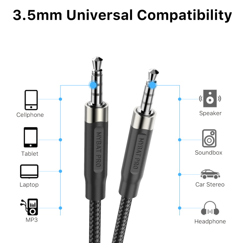 By offering the MyBat Pro 3.5mm Male to 3.5mm Male Audio Cable, your customers can still enjoy high-fidelity audio on devices without Bluetooth. It is available in attractive packaging that makes it stand out on the shelf and shows off the product beautifully, making it an ideal addition to your inventory. The Audio Cable connects to any 3.5mm auxiliary port, allowing your customers to listen to audio from their phone, tablet, laptop, and other media-playing devices on portable speakers and on their home and car stereos. The built-in digital to analog converter and gold-plated connectors ensure your customers hear the purest sound possible for booming bass, detailed midranges, and clear highs. As it's made of sturdy, flexible braided nylon with strain relief collars and flexible protective jacketing, it'll last a lot longer than an average audio cable. At the perfect extended length of 4ft/1.2m, your customers won't struggle with excess length or tangles while reaching any device! MyBat Pro offers a lifetime warranty for the 3.5mm Male to 3.5mm Male Audio Cable, ensuring the best quality, performance, and customer satisfaction. Features: Male to Male Cable Works With All 3.5mm Jacks or Auxilary Ports High-Definition Playback Built-In Digital to Analog Converter Seamless Plug & Play Braided Nylon Construction Beveled Step-Down Design Unrivaled Durability Incredible Bend Lifetime Extended Length Lifetime Warranty