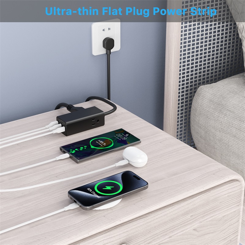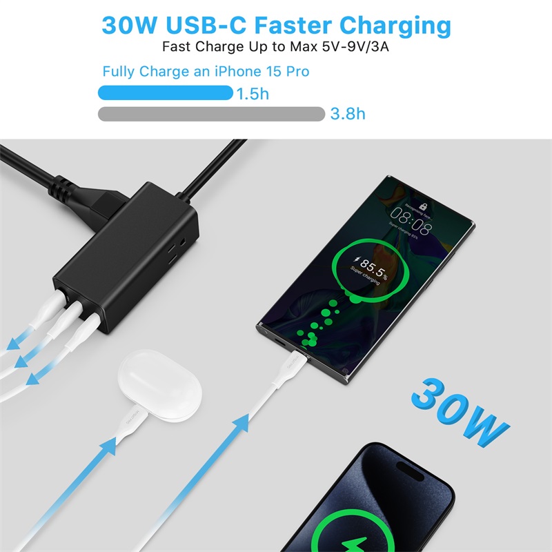5-IN-1 USB C Power Strip for Dorm room,Home, Office, Travel2 AC outlets and 3 USB charging ports ( 2 USB C ) provide power and real fast charging.2 Side Compact Design, take less space without blocking.6 Ft heavy duty extension cord with low-profile flat plug, great for stashing under or behind furniture.Specifications:Model: TC-076CA30Nominal Voltage: 100-120VRated Power: 1500W MaxRated Current: 13AInput: 100-240V 50/60Hz 0.8AOutput:USB-C1/C2: 5V/3A, 9V/3A, 12V/2.5A, 15V/2A, 20V/1.5A (30W Max)USB-A: 5V/3A, 9V/3A, 12V/2.5A, 20V/1.5A (30W Max) USB-C1+UBS-C2: 5V/3A USB-C1+USB-A: 5V/3A USB-C2+USB-A: 5V/3A USB-C1+USB-C2+USB-A: 5V/3A