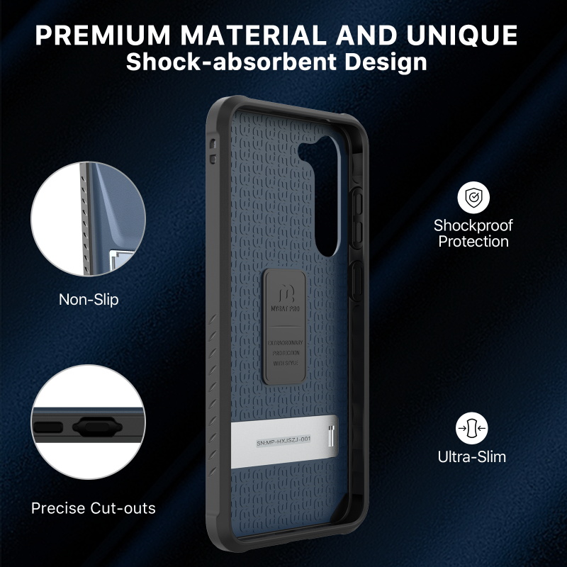 SLIP PROOF & ANTI-FINGERPRINT-Our Anti-Slip Samsung Galaxy case for men is engineered with our professinal technology, an Impact Protection System to cushion your precious phone when it slips out of your hand. Special anti-fingerprint treatment keep this simple case clean and gentlemanlike. SHOCK-ABSORBENT-Ultra lightweight slim Samsung Galaxy S23 Plus case featuring a “m” shape cushioning shock-absorbing soft core with impact resistant bumpers. The four raised inside protective pads keep the phone case and the phone at a certain distance, which can reduce the impact when the phone falls. A raised bezel lip adds an additional layer of protection for the screen & camera. EMBEDDED ULTRA SLIM KICKSTAND-This Samsung Galaxy case with stand can be adjusted to 75°(maximum to 65mm wide) to stand horizontally stablely to meet a variety of life and work scenarios. It offers the most optimal viewing points to watch films and alleviates your neck, wrist pain, definitely the go-to for long-sit office workers. WIRELESS CHARGING AVAILABLE-Apple pay & Wireless charging compatible with most 3rd party wireless chargers. MagSafe charging compatible but does not lock onto MagSafe charger. Features: Kickstand Anti-fingerprint Anti-Slip Slim Design Shock-absorbent Raised Bezel Edges Easy Access: Ports & Buttons Wireless Charging Compatible