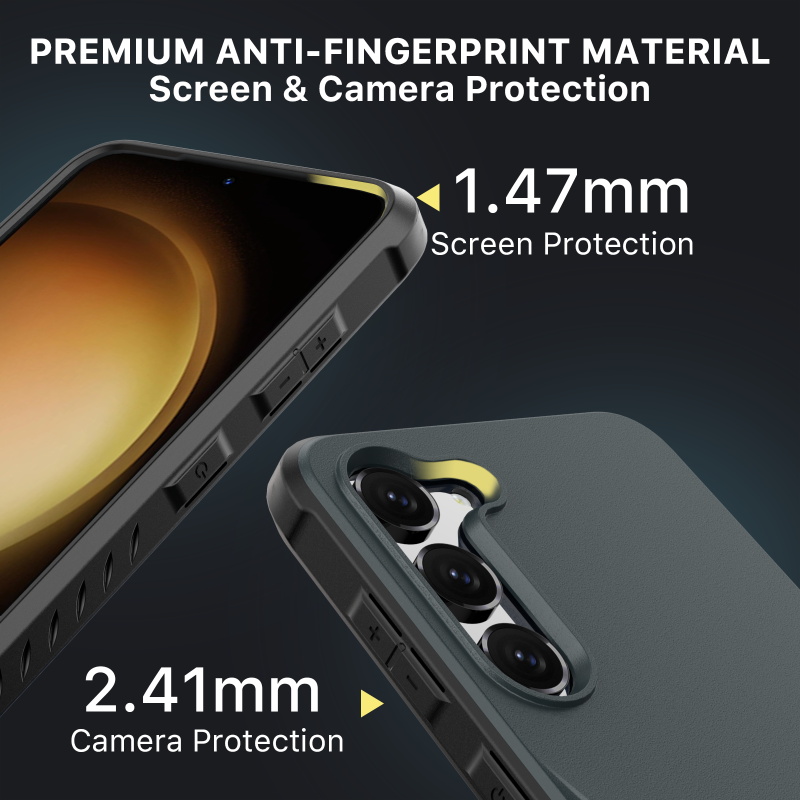 SLIP PROOF & ANTI-FINGERPRINT-Our Anti-Slip Samsung Galaxy case for men is engineered with our professinal technology, an Impact Protection System to cushion your precious phone when it slips out of your hand. Special anti-fingerprint treatment keep this simple case clean and gentlemanlike. SHOCK-ABSORBENT-Ultra lightweight slim Samsung Galaxy S23 Plus case featuring a “m” shape cushioning shock-absorbing soft core with impact resistant bumpers. The four raised inside protective pads keep the phone case and the phone at a certain distance, which can reduce the impact when the phone falls. A raised bezel lip adds an additional layer of protection for the screen & camera. EMBEDDED ULTRA SLIM KICKSTAND-This Samsung Galaxy case with stand can be adjusted to 75°(maximum to 65mm wide) to stand horizontally stablely to meet a variety of life and work scenarios. It offers the most optimal viewing points to watch films and alleviates your neck, wrist pain, definitely the go-to for long-sit office workers. WIRELESS CHARGING AVAILABLE-Apple pay & Wireless charging compatible with most 3rd party wireless chargers. MagSafe charging compatible but does not lock onto MagSafe charger. Features: Kickstand Anti-fingerprint Anti-Slip Slim Design Shock-absorbent Raised Bezel Edges Easy Access: Ports & Buttons Wireless Charging Compatible