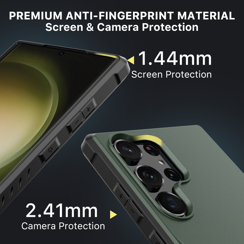 SLIP PROOF & ANTI-FINGERPRINT-Our Anti-Slip Samsung Galaxy case for men is engineered with our professinal technology, an Impact Protection System to cushion your precious phone when it slips out of your hand. Special anti-fingerprint treatment keep this simple case clean and gentlemanlike. SHOCK-ABSORBENT-Ultra lightweight slim Samsung Galaxy S23 Ultra case featuring a “m” shape cushioning shock-absorbing soft core with impact resistant bumpers. The four raised inside protective pads keep the phone case and the phone at a certain distance, which can reduce the impact when the phone falls. A raised bezel lip adds an additional layer of protection for the screen & camera. EMBEDDED ULTRA SLIM KICKSTAND-This Samsung Galaxy S23 Ultra case with stand can be adjusted to 75°(maximum to 65mm wide) to stand horizontally stablely to meet a variety of life and work scenarios. It offers the most optimal viewing points to watch films and alleviates your neck, wrist pain, definitely the go-to for long-sit office workers. WIRELESS CHARGING AVAILABLE-Apple pay & Wireless charging compatible with most 3rd party wireless chargers. MagSafe charging compatible but does not lock onto MagSafe charger. Features: Kickstand Anti-fingerprint Anti-Slip Slim Design Shock-absorbent Raised Bezel Edges Easy Access: Ports & Buttons Wireless Charging Compatible
