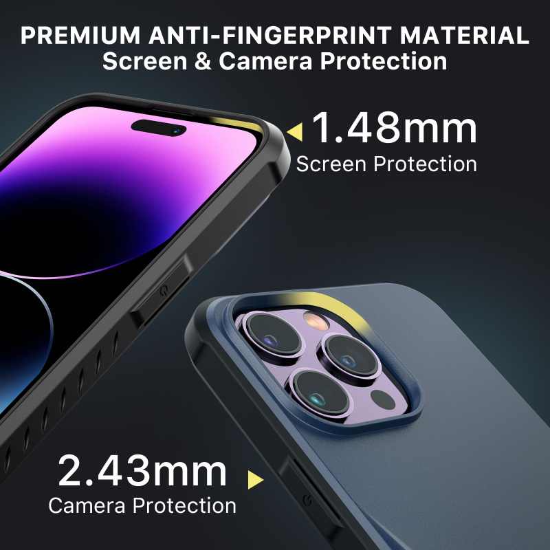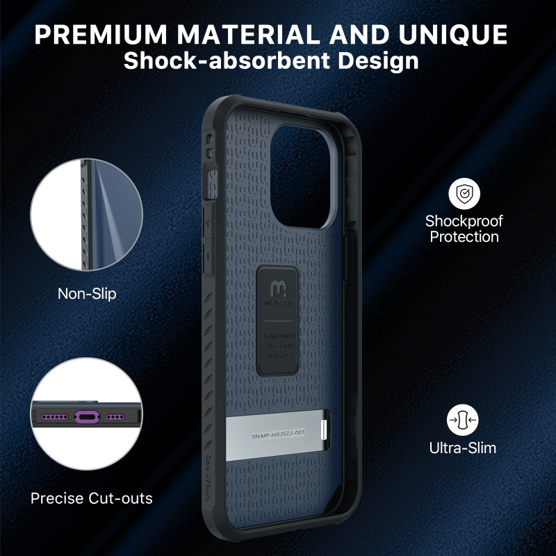 SLIP PROOF & ANTI-FINGERPRINT-Our Anti-Slip iPhone case for men is engineered with our professinal technology, an Impact Protection System to cushion your precious phone when it slips out of your hand. Special anti-fingerprint treatment keep this simple case clean and gentlemanlike. SHOCK-ABSORBENT-Ultra lightweight slim iPhone case featuring a “m” shape cushioning shock-absorbing soft core with impact resistant bumpers. The four raised inside protective pads keep the phone case and the phone at a certain distance, which can reduce the impact when the phone falls. A raised bezel lip adds an additional layer of protection for the screen & camera. EMBEDDED ULTRA SLIM KICKSTAND-This iPhone case with stand can be adjusted to 75° (maximum to 65mm wide) to stand horizontally stablely to meet a variety of life and work scenarios. It offers the most optimal viewing points to watch films and alleviates your neck, wrist pain, definitely the go-to for long-sit office workers. WIRELESS CHARGING AVAILABLE-Apple pay & Wireless charging compatible with most 3rd party wireless chargers. MagSafe charging compatible but does not lock onto MagSafe charger. Also it is iPhone case with screen protector. Features: Kickstand Anti-fingerprint Anti-Slip Slim Design Shock-absorbent Raised Bezel Edges Easy Access: Ports & Buttons Wireless Charging Compatible Includes 9H HD Tempered Glass