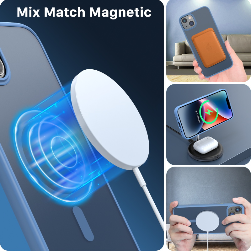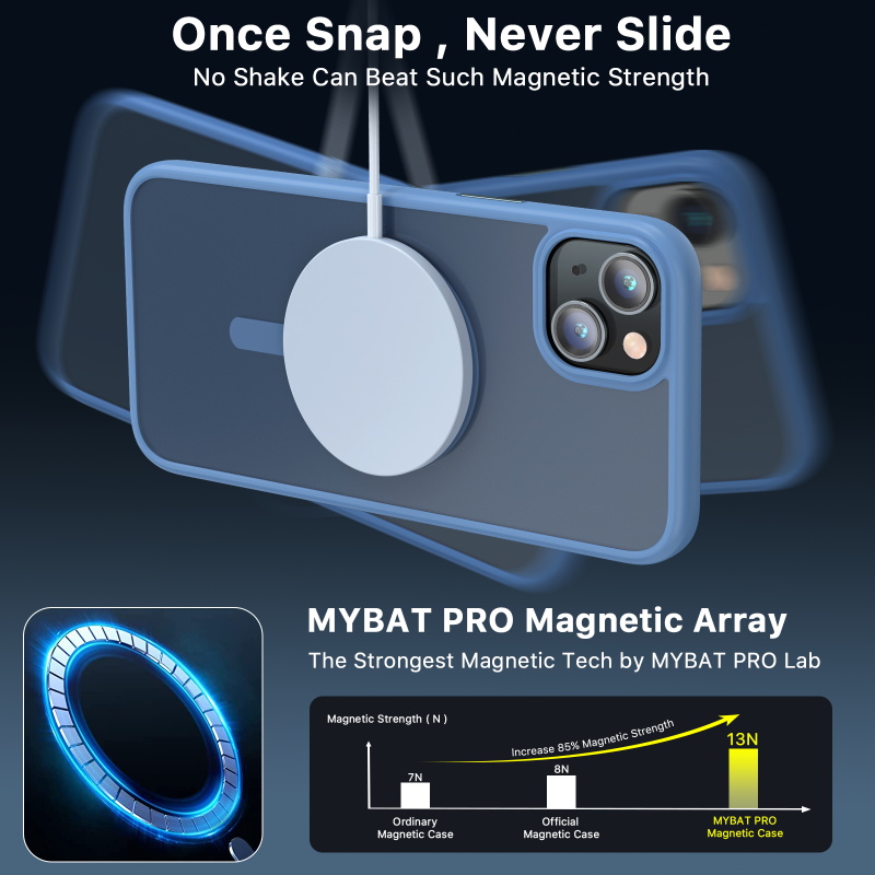 Compatible with MagSafe Accessories: 36 Pieces of N52 Super-strong Magnets, The Strength of Up to the 13N Vertically, Keeps Your Magnetic iPhone Phone Case Attached Perfectly. The Embedded Magnetic Ring Undergoes Thousands of Hours of Testing Under High Pressure. It Will Never Fall Off, Never Crack, Never Curve., Can be Firmly Connected to All MagSafe Accessories Like Magsafe Charger, Wallet, Battery Pack, Car Mount, and Will Not Fall off No Matter How It Rotates or Sways.12ft Military-grade Drop Protection: Made from TPU Bumper of 4-ply Cushioning Structure and Tough Polycarbonate, and Crafted with Exclusive X-shock 5.0 Technology on All 4 Corners, 360°shockproof Airbags Inside, This Protective iPhone 14 Plus (6.7) Case Are Certified to Withstand Drops of Up to 12 Ft,provides Excellent Protection for Your Phone .The 1.5mm Screen Lips, 0.9mm Camera Bezels Airbags Protect Your Expensive Device from Dirt, Scratches, and Drops.Slim Profile & Secure Grip: The iPhone Phone Case Features Minimal Bulkiness with Maximum Protection Thanks to Our MYBAT Pro Airbag Tech and Ergonomic Design. Upgraded Frosted Nano Oleophobic Coating is Anti-fingerprint and Anti-scratch ,and Giving a Velvety Smooth and Silky Touch. Plus, the Soft Side Bumper is Built Using Advanced Sliproof Provides a Comfortable Grip for Confident Handling.3 Aluminum Alloy Buttons: Case for iPhone Phone is Innovatively Equipped with Independent Buttons More Sensitive and Easier to Press, Easy Access for Ring On/off Switch and Volume Buttons, Click Up and Down As if Not Even Covered, No Worrying About Sticking or Being Stiff That Those Clear or Leather Case Have.Always Giving You Clicky Touch Feedback and Nice Tactile Feel.Flawless Compatibility & Professional Support: This Slim iPhone 14 Plus (6.7) Case for Magsafe,designed and Flawlessly Formed to Fit Every Curve, Button, and Cut Out. So Please Check Your Phone Model Before Purchasing. if You Encounter Any Problems Please Contact Us Through the Amazon Message Center, and You Will Get Support within 24 Hrs. Features:Magnetic Guardian Designed12ft Military-grade Drop Protection SuperstrongMagnet Holds Seamlessly Compatible with Magsafe Accessories FlawlesslyTranslucent Matte Case CompatibleDesign/Finish:RuggedMaterial:Rigid Plastic/Silicone/Gel/Rubber Color:White,Black,Green,Light Blue,Dark BlueCompatible Brand:For AppleShock Protection Slim, Sleek, METAL ButtonsMagnetic Back Drop TestedMIL-STD 810G-516.6Lifetime From Manufacturer