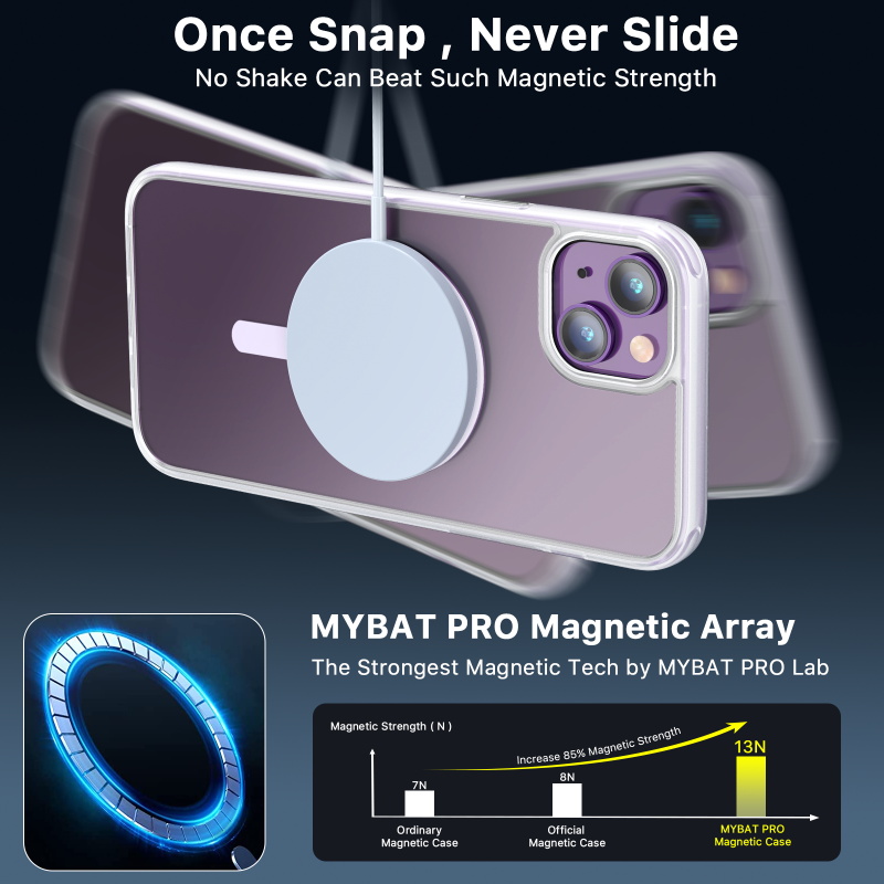 Compatible with MagSafe Accessories: 36 Pieces of N52 Super-strong Magnets, The Strength of Up to the 13N Vertically, Keeps Your Magnetic iPhone Phone Case Attached Perfectly. The Embedded Magnetic Ring Undergoes Thousands of Hours of Testing Under High Pressure. It Will Never Fall Off, Never Crack, Never Curve., Can be Firmly Connected to All MagSafe Accessories Like Magsafe Charger, Wallet, Battery Pack, Car Mount, and Will Not Fall off No Matter How It Rotates or Sways.12ft Military-grade Drop Protection: Made from TPU Bumper of 4-ply Cushioning Structure and Tough Polycarbonate, and Crafted with Exclusive X-shock 5.0 Technology on All 4 Corners, 360°shockproof Airbags Inside, This Protective iPhone 14 Plus (6.7) Case Are Certified to Withstand Drops of Up to 12 Ft,provides Excellent Protection for Your Phone .The 1.5mm Screen Lips, 0.9mm Camera Bezels Airbags Protect Your Expensive Device from Dirt, Scratches, and Drops.Slim Profile & Secure Grip: The iPhone Phone Case Features Minimal Bulkiness with Maximum Protection Thanks to Our MYBAT Pro Airbag Tech and Ergonomic Design. Upgraded Frosted Nano Oleophobic Coating is Anti-fingerprint and Anti-scratch ,and Giving a Velvety Smooth and Silky Touch. Plus, the Soft Side Bumper is Built Using Advanced Sliproof Provides a Comfortable Grip for Confident Handling.3 Aluminum Alloy Buttons: Case for iPhone Phone is Innovatively Equipped with Independent Buttons More Sensitive and Easier to Press, Easy Access for Ring On/off Switch and Volume Buttons, Click Up and Down As if Not Even Covered, No Worrying About Sticking or Being Stiff That Those Clear or Leather Case Have.Always Giving You Clicky Touch Feedback and Nice Tactile Feel.Flawless Compatibility & Professional Support: This Slim iPhone 14 Plus (6.7) Case for Magsafe,designed and Flawlessly Formed to Fit Every Curve, Button, and Cut Out. So Please Check Your Phone Model Before Purchasing. if You Encounter Any Problems Please Contact Us Through the Amazon Message Center, and You Will Get Support within 24 Hrs. Features:Magnetic Guardian Designed12ft Military-grade Drop Protection SuperstrongMagnet Holds Seamlessly Compatible with Magsafe Accessories FlawlesslyTranslucent Matte Case CompatibleDesign/Finish:RuggedMaterial:Rigid Plastic/Silicone/Gel/Rubber Color:White,Black,Green,Light Blue,Dark BlueCompatible Brand:For AppleShock Protection Slim, Sleek, METAL ButtonsMagnetic Back Drop TestedMIL-STD 810G-516.6Lifetime From Manufacturer