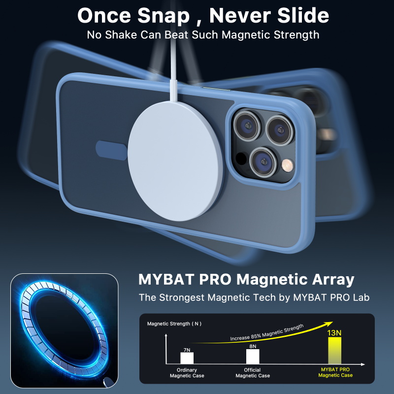Compatible with MagSafe Accessories: 36 Pieces of N52 Super-strong Magnets, The Strength of Up to the 13N Vertically, Keeps Your Magnetic iPhone Phone Case Attached Perfectly. The Embedded Magnetic Ring Undergoes Thousands of Hours of Testing Under High Pressure. It Will Never Fall Off, Never Crack, Never Curve., Can be Firmly Connected to All MagSafe Accessories Like Magsafe Charger, Wallet, Battery Pack, Car Mount, and Will Not Fall off No Matter How It Rotates or Sways.12ft Military-grade Drop Protection: Made from TPU Bumper of 4-ply Cushioning Structure and Tough Polycarbonate, and Crafted with Exclusive X-shock 5.0 Technology on All 4 Corners, 360°shockproof Airbags Inside, This Protective iPhone 14 Pro (6.1) Case Are Certified to Withstand Drops of Up to 12 Ft,provides Excellent Protection for Your Phone .The 1.5mm Screen Lips, 0.9mm Camera Bezels Airbags Protect Your Expensive Device from Dirt, Scratches, and Drops.Slim Profile & Secure Grip: The iPhone Phone Case Features Minimal Bulkiness with Maximum Protection Thanks to Our MYBAT Pro Airbag Tech and Ergonomic Design. Upgraded Frosted Nano Oleophobic Coating is Anti-fingerprint and Anti-scratch ,and Giving a Velvety Smooth and Silky Touch. Plus, the Soft Side Bumper is Built Using Advanced Sliproof Provides a Comfortable Grip for Confident Handling.3 Aluminum Alloy Buttons: Case for iPhone Phone is Innovatively Equipped with Independent Buttons More Sensitive and Easier to Press, Easy Access for Ring On/off Switch and Volume Buttons, Click Up and Down As if Not Even Covered, No Worrying About Sticking or Being Stiff That Those Clear or Leather Case Have.Always Giving You Clicky Touch Feedback and Nice Tactile Feel.Flawless Compatibility & Professional Support: This Slim iPhone 14 Pro (6.1) Case for Magsafe,designed and Flawlessly Formed to Fit Every Curve, Button, and Cut Out. So Please Check Your Phone Model Before Purchasing. if You Encounter Any Problems Please Contact Us Through the Amazon Message Center, and You Will Get Support within 24 Hrs. Features:Magnetic Guardian Designed12ft Military-grade Drop Protection SuperstrongMagnet Holds Seamlessly Compatible with Magsafe Accessories FlawlesslyTranslucent Matte Case CompatibleDesign/Finish:RuggedMaterial:Rigid Plastic/Silicone/Gel/Rubber Color:White,Black,Green,Light Blue,Dark BlueCompatible Brand:For AppleShock Protection Slim, Sleek, METAL ButtonsMagnetic Back Drop TestedMIL-STD 810G-516.6Lifetime From Manufacturer