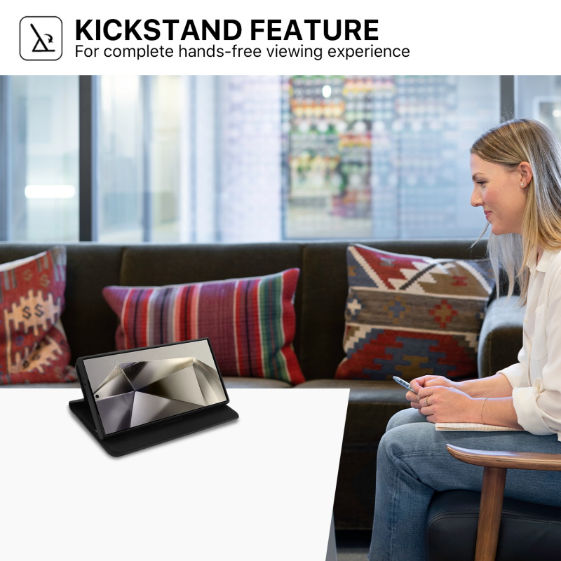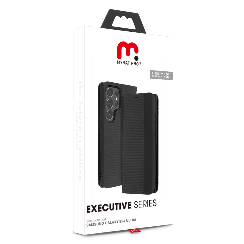 Outfit your customer’s Samsung Galaxy S24 Ultra with top-of-the-line protection and convenience as the black Executive Series Wallet Case from MyBat Pro provides an elegant all-in-one solution to keeping their essentials within reach. It is available in attractive packaging that makes it stand out on the shelf and shows off the product beautifully, making it an ideal addition to your inventory.The Executive Series Galaxy S24 Ultra Wallet Case’s slim, ultra-slim 3-in-1 design is ideal for professionals on the go. It allows them to securely store 2 of their most important cards, cash, and their Galaxy S24 Ultra, leaving more room in their pockets and bags. Customers benefit from the high level of security and protection that the protective magnetic closure provides while protecting their valuables. They can also easily catch up on shows and videos while on the go as the Executive Series Galaxy S24 Ultra Wallet Case folds into a horizontal stand for the perfect hands-free view. Due to its snug fit on their Galaxy S24 Ultra, customers will enjoy easy access to all buttons and ports. Designed with premium anti-microbial materials, the Executive protects your customer's valuables from all threats, big or small.MyBat Pro offers an extended lifetime warranty for the Executive Series Wallet Case For Galaxy S24 Ultra, ensuring the best quality, performance, and customer satisfaction.Features:3-in-1 Design2 Card Slots + Cash StorageProtective Inner Phone CaseRaised Bezel EdgesEasy Access: Ports, Buttons & CardsFoldable Horizontal StandSecure Magnetic ClosureUltra-Slim, Lightweight & Minimal DesignPremium Anti-Microbial MaterialsQuick Installation & RemovalLifetime Warranty