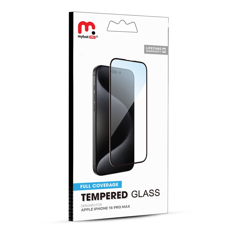 Provide your customer’s iPhone 16 Pro Max with edge-to-edge protection from the unexpected as MyBat Pro’s Full CoverageTempered Glass Screen Protector provides the perfect preventative barrier between their phone's precious screen and the elements. It is available in attractive packaging that makes it stand out on the shelf and shows off the product beautifully, making it an ideal addition to your inventory. MyBat Pro’s iPhone 16 Pro Max Full Coverage Tempered Glass Screen Protector offers your customer’s phone a comprehensive multi-layer defense 5X stronger than standard glass while delivering diamond level 9H hardness. Installing it is easy and leaves no air bubbles or distortions, only high-definition clarity. Despite being only 0.33mm thick and extremely lightweight, customers' iPhone 16 Pro Max screens will have maximum scratch, drop, impact, and shatter protection. The oleophobic coating will ensure that they will never have to worry about smudges, fingerprints, or dirt littering their screen again. The iPhone 16 Pro Max Full Coverage Tempered Glass Screen Protector offers a perfect fit without limiting any touch sensitivity, even with a case on. MyBat Pro offers an extended lifetime warranty for the Full Coverage Tempered Glass Screen Protector for iPhone 16 Pro Max, ensuring the best quality, performance, and customer satisfaction. Features: Edge-To-Edge Full Coverage 9H Hardness Rating Multi-Layered 5X Stronger Than Standard Glass Scratch Resistant Impact & Shatter Protection Oleophobic Anti-Fingerprint Coating High-Definition Screen Clarity Incredibly Thin: 0.33mm Rounded Edges High-Response Touch Sensitivity Easy Bubble-Free Application Lifetime Warranty