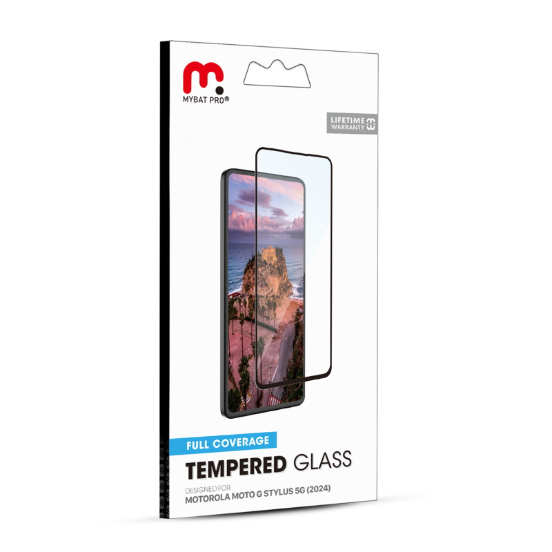 Provide your customer’s Motorola Moto G Stylus 5G (2024) with edge-to-edge protection from the unexpected as MyBat Pro’s Full CoverageTempered Glass Screen Protector provides the perfect preventative barrier between their phone's precious screen and the elements. It is available in attractive packaging that makes it stand out on the shelf and shows off the product beautifully, making it an ideal addition to your inventory.MyBat Pro’s Moto G Stylus 5G (2024) Full Coverage Tempered Glass Screen Protector offers your customer’s phone a comprehensive multi-layer defense 5X stronger than standard glass while delivering diamond level 9H hardness. Installing it is easy and leaves no air bubbles or distortions, only high-definition clarity. Despite being only 0.33mm thick and extremely lightweight, customers' Moto G Stylus 5G (2024) screens will have maximum scratch, drop, impact, and shatter protection. The oleophobic coating will ensure that they will never have to worry about smudges, fingerprints, or dirt littering their screen again. The Moto G Stylus 5G (2024) Full Coverage Tempered Glass Screen Protector offers a perfect fit without limiting any touch sensitivity, even with a case on.MyBat Pro offers an extended lifetime warranty for the Full Coverage Tempered Glass Screen Protector for Moto G Stylus 5G (2024), ensuring the best quality, performance, and customer satisfaction.Features:Edge-To-Edge Full Coverage9H Hardness RatingMulti-Layered5X Stronger Than Standard GlassScratch ResistantImpact & Shatter ProtectionOleophobic Anti-Fingerprint CoatingHigh-Definition Screen ClarityIncredibly Thin: 0.33mmRounded EdgesHigh-Response Touch SensitivityEasy Bubble-Free ApplicationLifetime Warranty