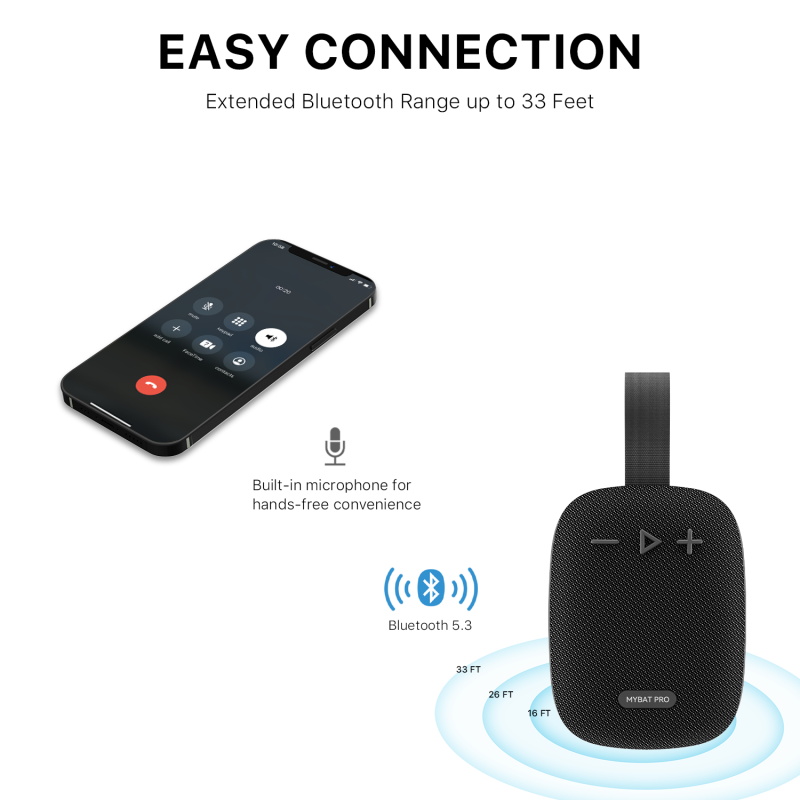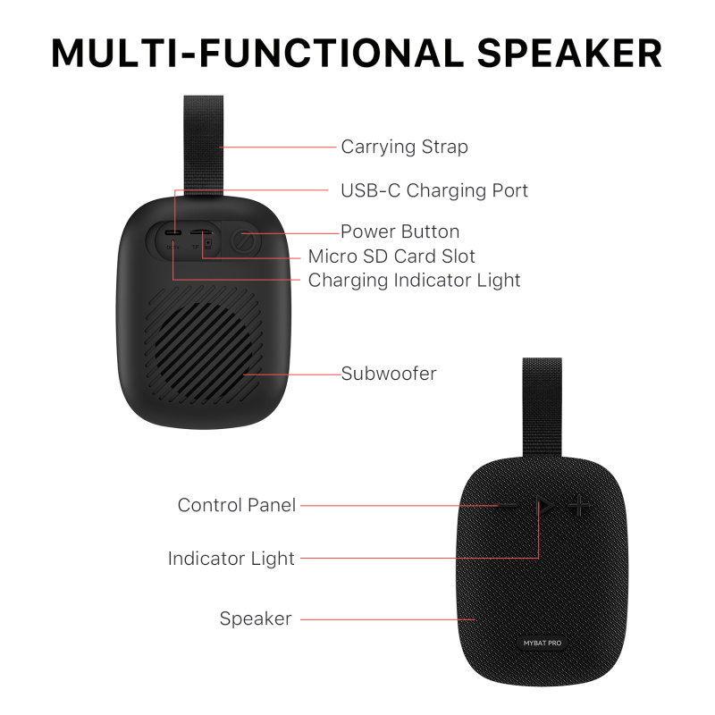 Your customers will enjoy a great splash of sound with the Hook Bluetooth Speaker from MyBat Pro. Featuring impressive packaging, these attractive, trendy speakers are sure to fly off the shelves, making them an ideal addition to your inventory! The Hook Bluetooth Speaker is equipped with the latest Bluetooth 5.3 technology to seamlessly sync and pair with all of your customers' wireless devices. Designed for outdoor adventures, camping, and traveling, the Oasis is water-resistant up to IPX5. A built-in microphone and controls enable your customers to quickly navigate playlists, make or receive calls, and adjust the volume while keeping their phones dry. Your customers won't need to check the weather since the Hook can brighten up any day with its long-lasting 5-hour playtime on a single charge! With its lightweight and comfortable silicone carrying strap, customers can attach it to backpacks or wear it around their wrists. MyBat Pro offers a limited one-year warranty for the Hook Bluetooth Speaker, ensuring the best quality, performance, and customer satisfaction. Features: Powerful High-Definition Sound Wireless Music & Calls Built-In Microphone Up to 5 HRS of Playtime LED Battery Life Indicator IPX5 Waterproof Micro SD Compatible Built-In Carrying Strap Ultra-Compact, Lightweight & Portable Limited 1-Year Warranty