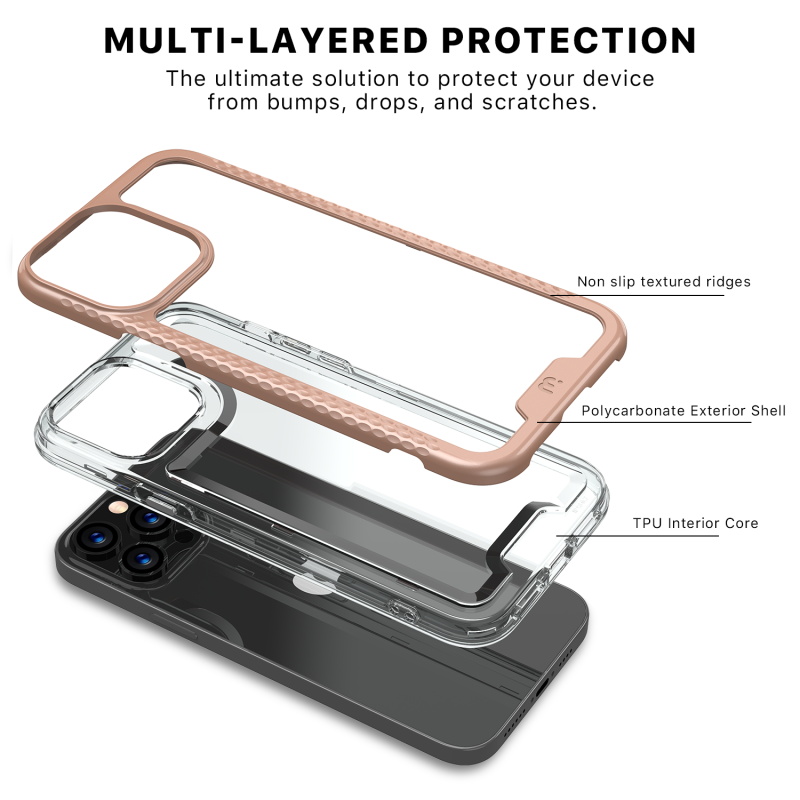 You can offer your customers even more luxury for their Apple iPhone 13 Pro with the Lux series of cases from MyBat Pro. It is available in attractive packaging that makes it stand out on the shelf and shows off the product beautifully, making it an ideal addition to your inventory. Designed for those who are drawn to beauty over complexity, the modern and sleek Lux cases will display the regal color of your customer’s iPhone 13 Pro with a fully transparent backing. Protect your customer's iPhone 13 Pro from scratches, bumps, and drops with this stylish dual-layer design, a rose gold polycarbonate outer shell, and a padded TPU inner shell with 2X the durability of standard cases. The Lux clear case feature raised bezel edges and texturized ridged edges for additional safety while providing your customers easy access to all buttons and ports. The ultra-slim and lightweight design make it compatible with all wireless chargers, so they don’t have to remove the case every time they need to power up! The included high-grade tempered glass screen protector provides diamond-level protection, boasting an incredible 9H hardness and raised bezel edges to keep your customer's screen safe and pristine! MyBat Pro offers an extended lifetime warranty for the Lux Series Case For iPhone 13 Pro, ensuring the best quality, performance, and customer satisfaction. Features: Dual-Layered Certified Military-Grade Shock & Impact Protection Raised Bezel Edges Easy Access: Ports & Buttons Ultra-Slim, Lightweight & Minimal Design Premium Materials & Build Wireless Charging Compatible Quick Installation & Removal Lifetime Warranty