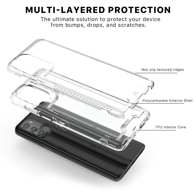 You can offer your customers even more luxury for their Motorola Moto 4G (2022) with the Lux series of cases from MyBat Pro. It is available in attractive packaging that makes it stand out on the shelf and shows off the product beautifully, making it an ideal addition to your inventory. Designed for those drawn to beauty over complexity, the modern and sleek Lux cases will display the regal color of your customer’s Moto 5G (2022) with fully transparent backing. Protect your customer's Moto 4G (2022) from scratches, bumps, and drops with this stylish dual-layer design, a clear polycarbonate outer shell, and a padded TPU inner shell with 2X the durability of standard cases. The Lux clear case feature raised bezel edges and texturized ridged edges for additional safety while providing your customers easy access to all buttons and ports. The ultra-slim and lightweight design make it compatible with all wireless chargers, so they don’t have to remove the case when they need to power up! The included high-grade tempered glass screen protector provides diamond-level protection, boasting an incredible 9H hardness and raised bezel edges to keep your customer's screen safe and pristine! MyBat Pro offers an extended lifetime warranty for the Lux Series Case For Moto 4G (2022), ensuring the best quality, performance, and customer satisfaction. Features: Dual-Layered Certified Military-Grade Shock & Impact Protection Raised Bezel Edges Easy Access: Ports & Buttons Ultra-Slim, Lightweight & Minimal Design Premium Materials & Build Wireless Charging Compatible Quick Installation & Removal Lifetime Warranty