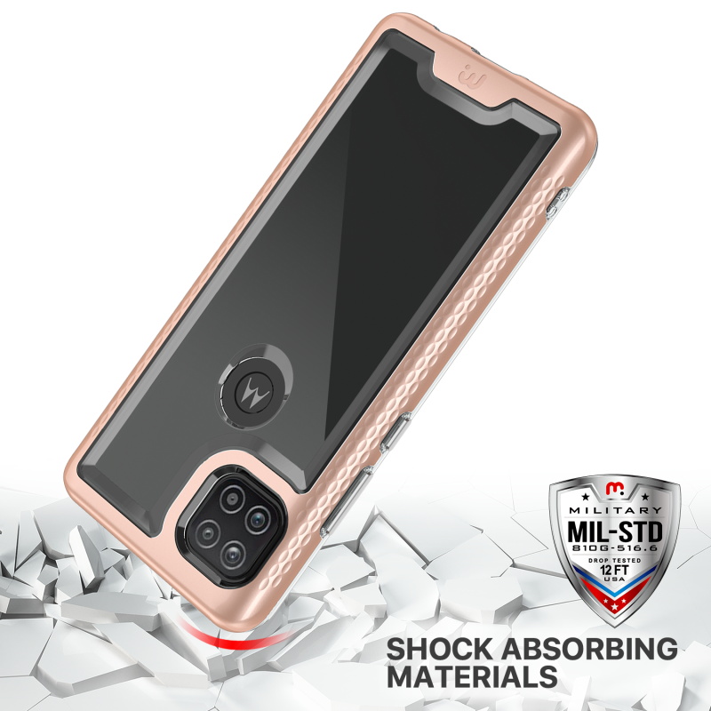 You can offer your customers even more luxury for their Motorola One 5G Ace with the Lux series of cases from MyBat Pro. It is available in attractive packaging that makes it stand out on the shelf and shows off the product beautifully, making it an ideal addition to your inventory. Designed for those drawn to beauty over complexity, the modern and sleek Lux cases will display the regal color of your customer’s One 5G Ace with fully transparent backing. Protect your customer's One 5G Ace from scratches, bumps, and drops with this stylish dual-layer design, a rose gold polycarbonate outer shell, and a padded TPU inner shell with 2X the durability of standard cases. The Lux clear case feature raised bezel edges and texturized ridged edges for additional safety while providing your customers easy access to all buttons and ports. The ultra-slim and lightweight design make it compatible with all wireless chargers, so they don’t have to remove the case when they need to power up! The included high-grade tempered glass screen protector provides diamond-level protection, boasting an incredible 9H hardness and raised bezel edges to keep your customer's screen safe and pristine! MyBat Pro offers an extended lifetime warranty for the Lux Series Case For One 5G Ace, ensuring the best quality, performance, and customer satisfaction. Features: Dual-Layered Certified Military-Grade Shock & Impact Protection Raised Bezel Edges Easy Access: Ports & Buttons Ultra-Slim, Lightweight & Minimal Design Premium Materials & Build Wireless Charging Compatible Quick Installation & Removal Lifetime Warranty