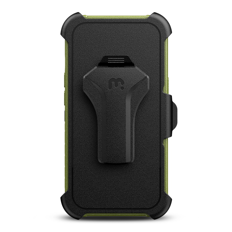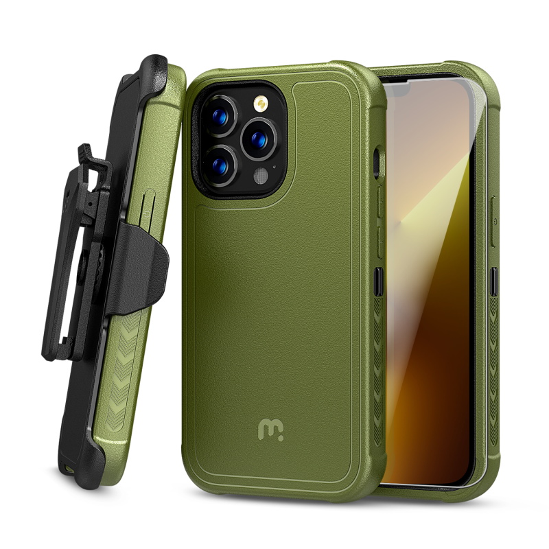 Gear up your customers' Apple iPhone 13 Pro with the Maverick Series Case from MyBat Pro, the ultimate rugged military-grade phone case built to withstand all treks, trails, and paths. It is available in attractive packaging that makes it stand out on the shelf and shows off the product beautifully, making it an ideal addition to your inventory. The Maverick Series iPhone 13 Pro Case provides the perfect barrier shielding for your customer’s iPhone 13 Pro with military-grade protection. The triple-layer construction of the case, including a rugged army green TPE backing shell, an anti-shock polycarbonate inner shell, and a polycarbonate exterior shell, provides the ultimate protection against drops, scratches, and cracks. They will experience the perfect in-hand feel with textured edges and a non-slip bumper grip for easy access to all buttons and ports. They can also attach the Maverick Series iPhone 13 Pro Case and go anywhere using the 360° rotating holster clip or set it down and use it as a kickstand for convenient hands-free viewing. Designed from anti-microbial materials, the Maverick Series iPhone 13 Pro Case can ward off any threat, even microscopic. Customers will also experience diamond-level coverage with the included high-grade tempered glass screen protector, boasting a 9H hardness keeping their iPhone 13 Pro screen safe and pristine! MyBat Pro offers an extended lifetime warranty for the Maverick Series Case For iPhone 13 Pro, ensuring the best quality, performance, and customer satisfaction. Features: Triple-Layered Certified Military Grade Impact & Shock Shock Protection Raised Bezel Edges Non-Slip Bumper Grip Easy Access: Ports & Buttons Anti-Microbial 360° Rotating Holster Clip & Kickstand Includes 9H HD Tempered Glass Lifetime Warranty