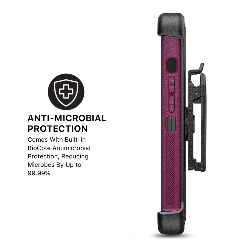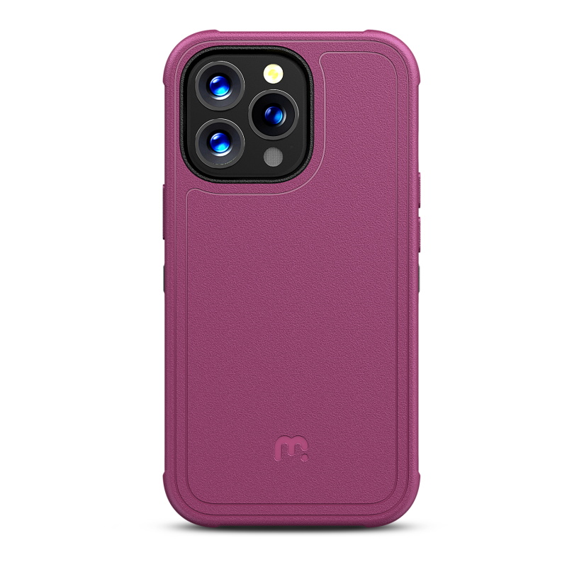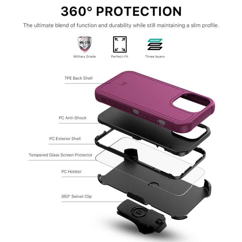 Gear up your customers' Apple iPhone 13 Pro with the Maverick Series Case from MyBat Pro, the ultimate rugged military-grade phone case built to withstand all treks, trails, and paths. It is available in attractive packaging that makes it stand out on the shelf and shows off the product beautifully, making it an ideal addition to your inventory. The Maverick Series iPhone 13 Pro Case provides the perfect barrier shielding for your customer’s iPhone 13 Pro with military-grade protection. The triple-layer construction of the case, including a rugged plum TPE backing shell, an anti-shock polycarbonate inner shell, and a polycarbonate exterior shell, provides the ultimate protection against drops, scratches, and cracks. They will experience the perfect in-hand feel with textured edges and a non-slip bumper grip for easy access to all buttons and ports. They can also attach the Maverick Series iPhone 13 Pro Case and go anywhere using the 360° rotating holster clip or set it down and use it as a kickstand for convenient hands-free viewing. Designed from anti-microbial materials, the Maverick Series iPhone 13 Pro Case can ward off any threat, even microscopic. Customers will also experience diamond-level coverage with the included high-grade tempered glass screen protector, boasting a 9H hardness keeping their iPhone 13 Pro screen safe and pristine! MyBat Pro offers an extended lifetime warranty for the Maverick Series Case For iPhone 13 Pro, ensuring the best quality, performance, and customer satisfaction. Features: Triple-Layered Certified Military Grade Impact & Shock Shock Protection Raised Bezel Edges Non-Slip Bumper Grip Easy Access: Ports & Buttons Anti-Microbial 360° Rotating Holster Clip & Kickstand Includes 9H HD Tempered Glass Lifetime Warranty