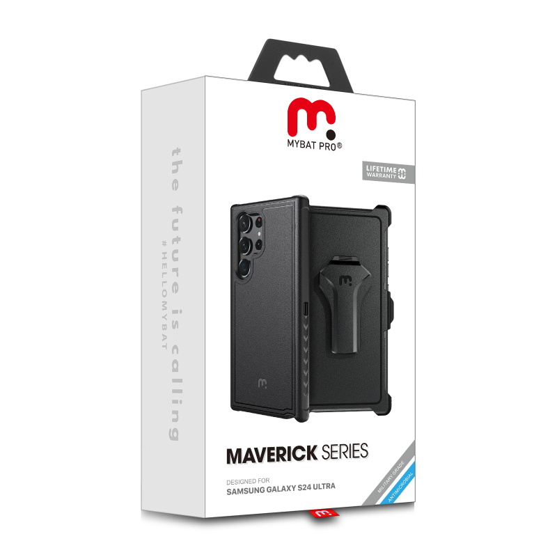 Gear up your customers' Samsung Galaxy S24 Ultra with the Maverick Series Case from MyBat Pro, the ultimate rugged military-grade phone case built to withstand all treks, trails, and paths. It is available in attractive packaging that makes it stand out on the shelf and shows off the product beautifully, making it an ideal addition to your inventory.The Maverick Series Galaxy S24 Ultra Case provides the perfect barrier shielding for your customer’s Galaxy S24 Ultra with military-grade protection. The triple-layer construction of the case, including a rugged black TPE backing shell, an anti-shock polycarbonate inner shell, and a polycarbonate exterior shell, provides the ultimate protection against drops, scratches, and cracks. They will experience the perfect in-hand feel with textured edges and a non-slip bumper grip for easy access to all buttons and ports. They can also attach the Maverick Series Galaxy S24 Ultra Case and go anywhere using the 360° rotating holster clip or set it down and use it as a kickstand for convenient hands-free viewing. Designed from anti-microbial materials, the Maverick Series Galaxy S24 Ultra Case can ward off any threat, even microscopic. MyBat Pro offers an extended lifetime warranty for the Maverick Series Case For Galaxy S24 Ultra, ensuring the best quality, performance, and customer satisfaction.Features:Triple-LayeredCertified Military GradeImpact & Shock Shock ProtectionRaised Bezel EdgesNon-Slip Bumper GripEasy Access: Ports & ButtonsAnti-Microbial360° Rotating Holster Clip & KickstandLifetime Warranty