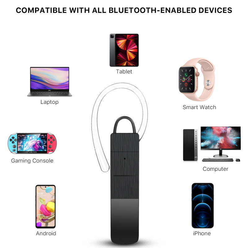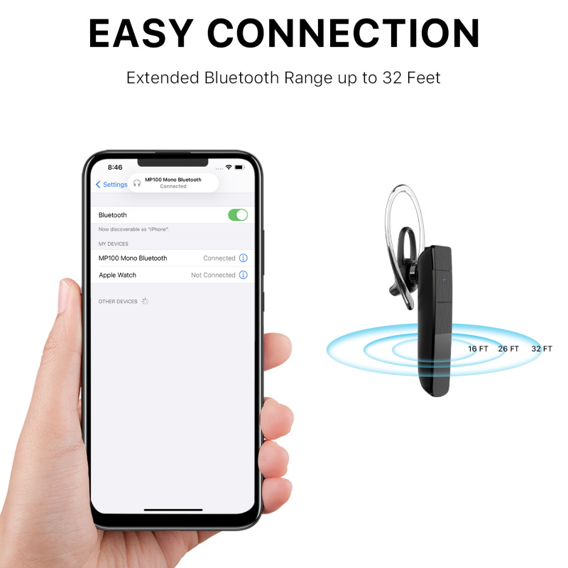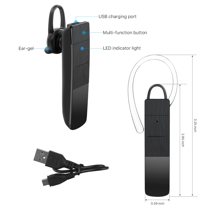 Product description: Name: MP100 Mono Bluetooth Headset Bluetooth version: Bluetooth 5.0 + EDR Support Bluetooth Protocol: A2DP, AVRCP, SPPP, HFP Battery: 50 mAh Track System: mono track Duration: about 4H Standby Time: about 50H Key Function Operation Power on: long press MFB button for about 3 seconds Shutdown: long press the MFB key for about 4 seconds Pairing mode: long press the MFB key to turn on the machine and the pairing state will enter Answer: click the MFB key to answer the call Hang up: click the MFB key to hang up the call Rejection: long press the 1-2s MFB key during the call to reject the call Final redial: double click the MFB key to realize final redial Play/pause: music state clicks MFB key to realize music play and pause Double click the MFB key in the unpaired state to switch between Chinese and English Power prompt: low voltage alarm