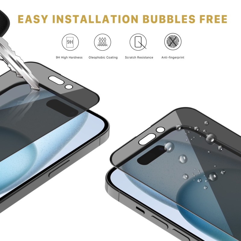 You can shield your customers' Apple iPhone 15 (6.1) screen with the MyBat Pro Full Coverage Privacy Tempered Glass Screen Protector, as it provides a preventative barrier that guards their phone screen from the elements and prying eyes. It is available in attractive packaging that makes it stand out on the shelf and shows off the product beautifully, making it an ideal addition to your inventory.MyBat Pro’s iPhone 15 (6.1) Full Coverage Privacy Tempered Glass Screen Protector offers your customer’s phone a comprehensive curved multi-layered defense 5X stronger than standard glass while delivering diamond level 9H hardness. The privacy coating ensures that only your customers can see their screens and that onlookers will get a filtered view of the screen, protecting valuable information and data. Installing it is easy and leaves no air bubbles or distortions, only high-definition clarity. Despite being only 0.33mm thick and extremely lightweight, customers' iPhone 15 (6.1) screens will have maximum scratch, drop, impact, and shatter protection. EZ Fingerprint Unlock makes it easy for your customers to access their phone at any time while the premium oleophobic coating ensures they'll never have to worry about smudges, fingerprints, or dirt littering their screen. The iPhone 15 (6.1) Full Coverage Privacy Tempered Glass Screen Protector offers a perfect fit without limiting any touch sensitivity, even with a case on.MyBat Pro offers an extended lifetime warranty for the Full Coverage Privacy Tempered Glass Screen Protector for iPhone 15 (6.1), ensuring the best quality, performance, and customer satisfaction.Features:Premium Privacy ScreenOnly Visible From Direct View9H Hardness RatingMulti-Layered5X Stronger Than Standard GlassScratch ResistantImpact & Shatter ProtectionOleophobic Anti-Fingerprint CoatingHigh-Definition Screen ClarityIncredibly Thin: 0.33mmRounded EdgesHigh-Response Touch SensitivityEasy Bubble-Free ApplicationLifetime Warranty
