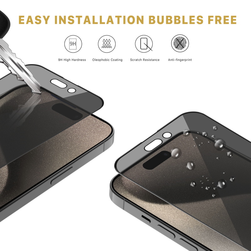 You can shield your customers' Apple iPhone 15 Pro Max (6.7) screen with the MyBat Pro Full Coverage Privacy Tempered Glass Screen Protector, as it provides a preventative barrier that guards their phone screen from the elements and prying eyes. It is available in attractive packaging that makes it stand out on the shelf and shows off the product beautifully, making it an ideal addition to your inventory.MyBat Pro’s iPhone 15 Pro Max (6.7) Full Coverage Privacy Tempered Glass Screen Protector offers your customer’s phone a comprehensive curved multi-layered defense 5X stronger than standard glass while delivering diamond level 9H hardness. The privacy coating ensures that only your customers can see their screens and that onlookers will get a filtered view of the screen, protecting valuable information and data. Installing it is easy and leaves no air bubbles or distortions, only high-definition clarity. Despite being only 0.33mm thick and extremely lightweight, customers' iPhone 15 Pro Max (6.7) screens will have maximum scratch, drop, impact, and shatter protection. EZ Fingerprint Unlock makes it easy for your customers to access their phone at any time while the premium oleophobic coating ensures they'll never have to worry about smudges, fingerprints, or dirt littering their screen. The iPhone 15 Pro Max (6.7) Full Coverage Privacy Tempered Glass Screen Protector offers a perfect fit without limiting any touch sensitivity, even with a case on.MyBat Pro offers an extended lifetime warranty for the Full Coverage Privacy Tempered Glass Screen Protector for iPhone 15 Pro Max (6.7), ensuring the best quality, performance, and customer satisfaction.Features:Premium Privacy ScreenOnly Visible From Direct View9H Hardness RatingMulti-Layered5X Stronger Than Standard GlassScratch ResistantImpact & Shatter ProtectionOleophobic Anti-Fingerprint CoatingHigh-Definition Screen ClarityIncredibly Thin: 0.33mmRounded EdgesHigh-Response Touch SensitivityEasy Bubble-Free ApplicationLifetime Warranty