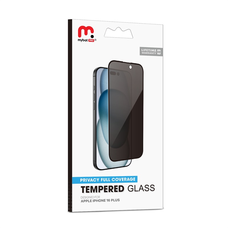 You can shield your customers' Apple iPhone 16 Plus screen with the MyBat Pro Full Coverage Privacy Tempered Glass Screen Protector, as it provides a preventative barrier that guards their phone screen from the elements and prying eyes. It is available in attractive packaging that makes it stand out on the shelf and shows off the product beautifully, making it an ideal addition to your inventory. MyBat Pro’s iPhone 16 Plus Full Coverage Privacy Tempered Glass Screen Protector offers your customer’s phone a comprehensive curved multi-layered defense 5X stronger than standard glass while delivering diamond level 9H hardness. The privacy coating ensures that only your customers can see their screens and that onlookers will get a filtered view of the screen, protecting valuable information and data. Installing it is easy and leaves no air bubbles or distortions, only high-definition clarity. Despite being only 0.33mm thick and extremely lightweight, customers' iPhone 16 Plus screens will have maximum scratch, drop, impact, and shatter protection. EZ Fingerprint Unlock makes it easy for your customers to access their phone at any time while the premium oleophobic coating ensures they'll never have to worry about smudges, fingerprints, or dirt littering their screen. The iPhone 16 Plus Full Coverage Privacy Tempered Glass Screen Protector offers a perfect fit without limiting any touch sensitivity, even with a case on. MyBat Pro offers an extended lifetime warranty for the Full Coverage Privacy Tempered Glass Screen Protector for iPhone 16 Plus, ensuring the best quality, performance, and customer satisfaction. Features: Premium Privacy Screen Only Visible From Direct View 9H Hardness Rating Multi-Layered 5X Stronger Than Standard Glass Scratch Resistant Impact & Shatter Protection Oleophobic Anti-Fingerprint Coating High-Definition Screen Clarity Incredibly Thin: 0.33mm Rounded Edges High-Response Touch Sensitivity Easy Bubble-Free Application Lifetime Warranty