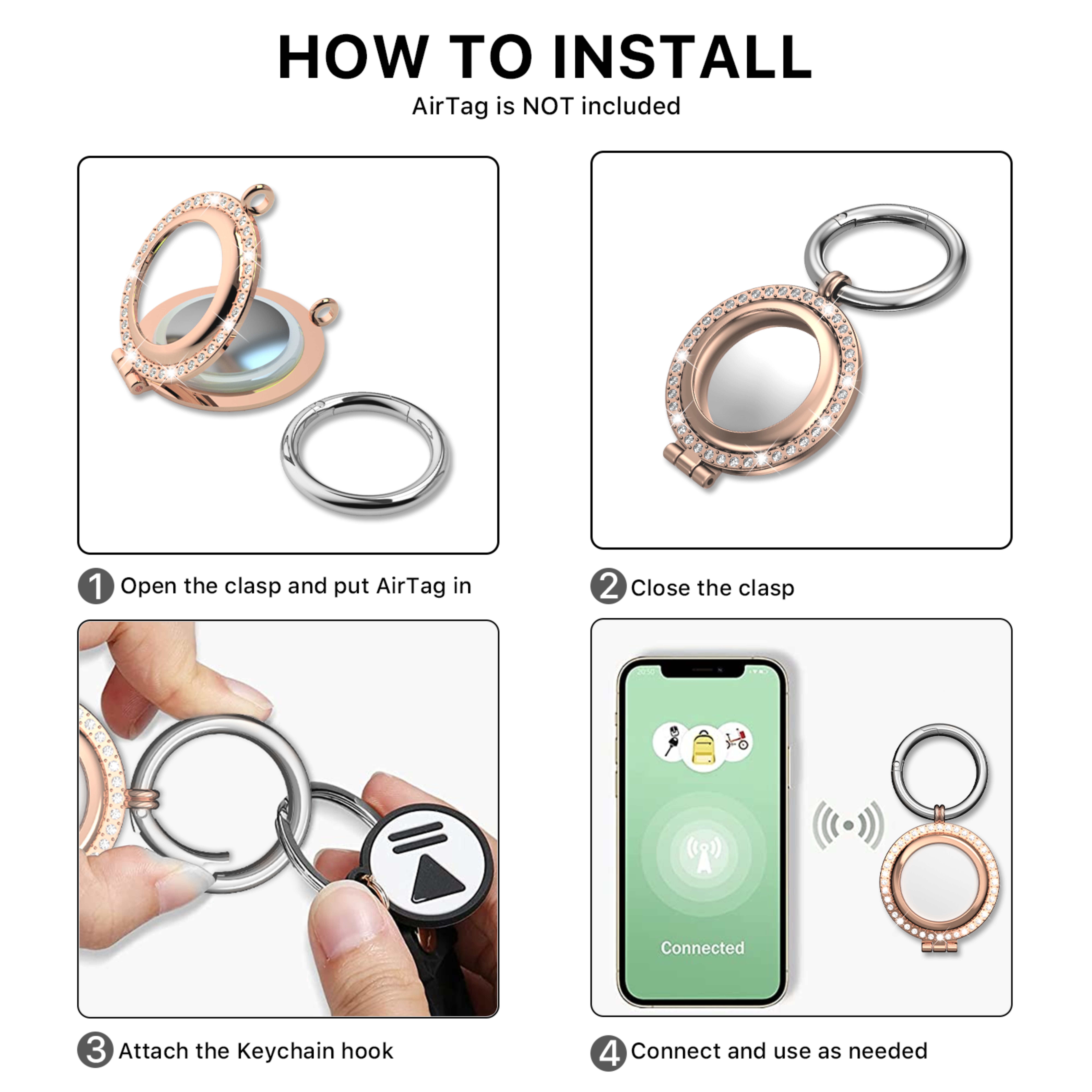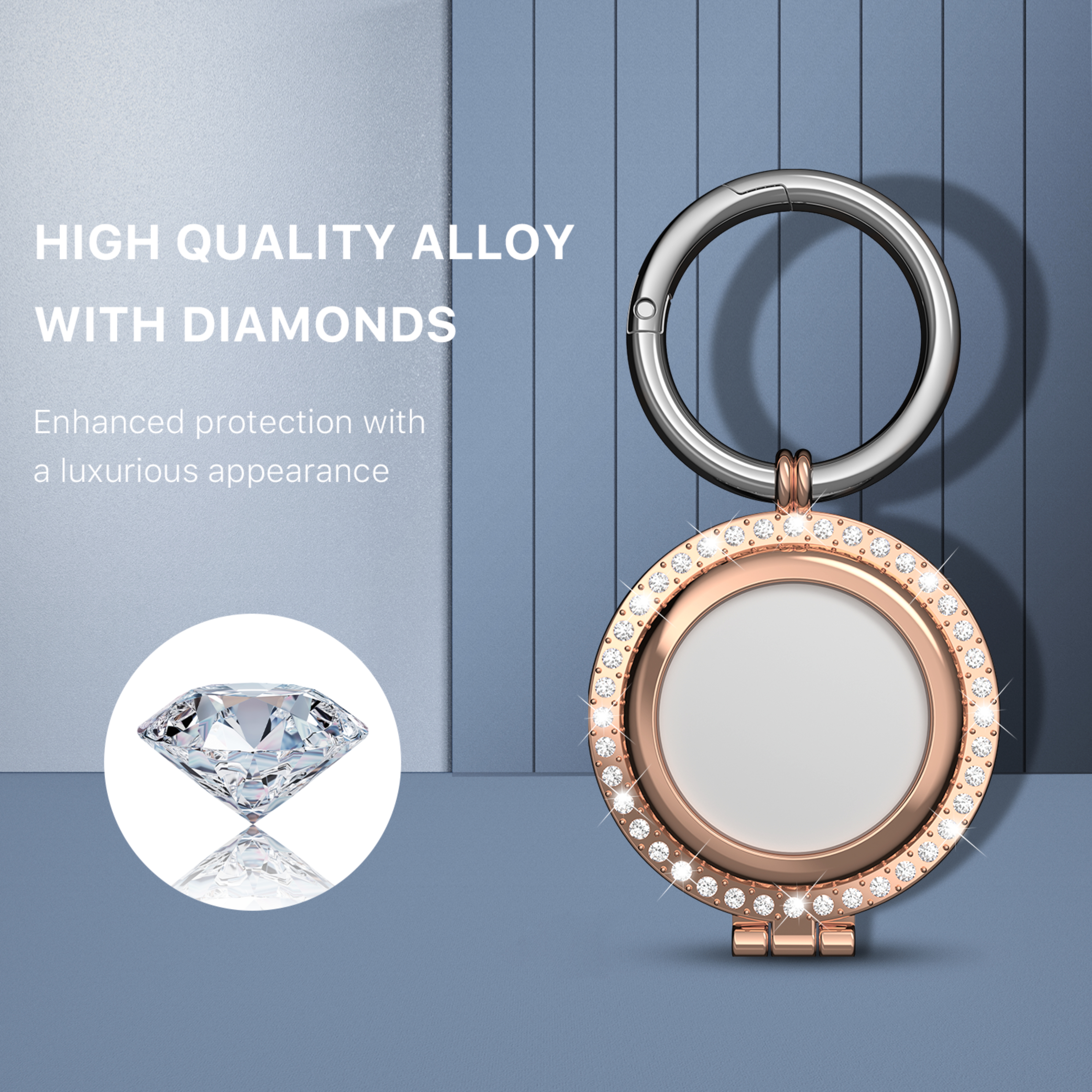Your customers can turn their Apple AirTags into beacons of style by adding a little bling to their trackers with the Rhinestone Keyring Case from MyBat Pro. It is available in attractive packaging that makes it stand out on the shelf and shows off the product beautifully, making it an ideal addition to your inventory. Crafted from an elegant metallic alloy inlaid with sparkling rhinestones and available in rose gold, your customers will enjoy the most fashionable safeguard to protect their precious AirTag from scratches or daily wear and tear. Their AirTags will stay safe and secure thanks to raised edges and easy-to-use clasp closure so that they can track them easily. Thanks to the handy carabiner keychain, the Rhinestone Keyring AirTag Case can easily be attached to the essential things in their lives, like their keys, backpack, or even their pets! MyBat Pro offers an extended lifetime warranty for the Rhinestone Key Ring Case for AirTag, ensuring the best quality, performance, and customer satisfaction. Features: Metallic Alloy Construction Elegant Rhinestone Inlay Scratch Resistant Quick Installation Clasp Closure Safe & Secure Design Raised Edges Convenient Carabiner Keychain Incredibly Durable & Lightweight Lifetime Warranty