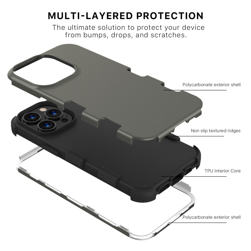 Offer your customers the most rugged Apple iPhone 13 Pro case around that can handle the roughest treks and terrains of everyday adventures with ease, the Tuff Series Case from MyBat Pro. It is available in attractive packaging that makes it stand out on the shelf and shows off the product beautifully, making it an ideal addition to your inventory. Toughen up your customer's iPhone 13 Pro with military-grade protection. The Tuff Series iPhone 13 Pro Cases' triple-layer design features a gray rugged polycarbonate outer shell and a padded silicone inner shell for maximum protection from drops, bumps, and scratches. The Tuff Series iPhone 13 Pro Case also features raised edges and textured non-slip ridges for added safety and support while remaining compact for easy access to all buttons and ports. The case is compatible with all wireless chargers, and its ultra-slim and lightweight design mean customers won't have to remove it every time they need to charge! MyBat Pro offers an extended lifetime warranty for the Tuff Series Case For iPhone 13 Pro, ensuring the best quality, performance, and customer satisfaction. Features: Triple-Layered Superior Durability Certified Military-Grade Raised Bezel Edges Easy Access: Ports & Buttons Ultra-Slim, Lightweight & Minimal Design Wireless Charging Compatible Quick Installation & Removal Lifetime Warranty