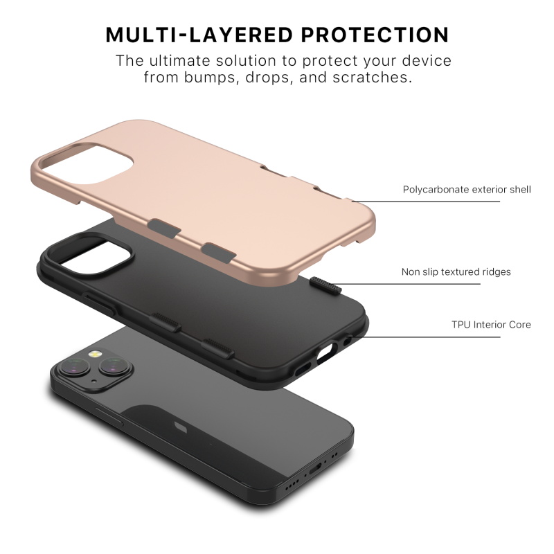 Your customers can slim down from bulky phone cases and toughen up their Apple iPhone 13 with the Tuff Subs Series Case from MyBat Pro. It is available in attractive packaging that makes it stand out on the shelf and shows off the product beautifully, making it an ideal addition to your inventory. Introducing the Tuff Subs Case, a new, thinner than ever phone case that provides true ruggedness to your customer's iPhone 13! It's tougher than it looks and takes advantage of everything that makes the classic Tuff Series so popular! Dual-layered protection, a rugged rose gold polycarbonate outer shell, and a rubberized silicone inner shell will provide maximum protection from accidental drops, bumps, and scratches to your customers' iPhone 13. Your customers can easily access all buttons and ports with raised bezel edges and texturized ergonomic ridged edges. MyBat Pro offers an extended lifetime warranty for the Tuff Subs Series Case For iPhone 13, ensuring the best quality, performance, and customer satisfaction. Features: Dual-Layered Superior Durability Raised Bezel Edges Easy Access: Ports & Buttons Ultra-Slim, Lightweight & Minimal Design Quick Installation & Removal Lifetime Warranty